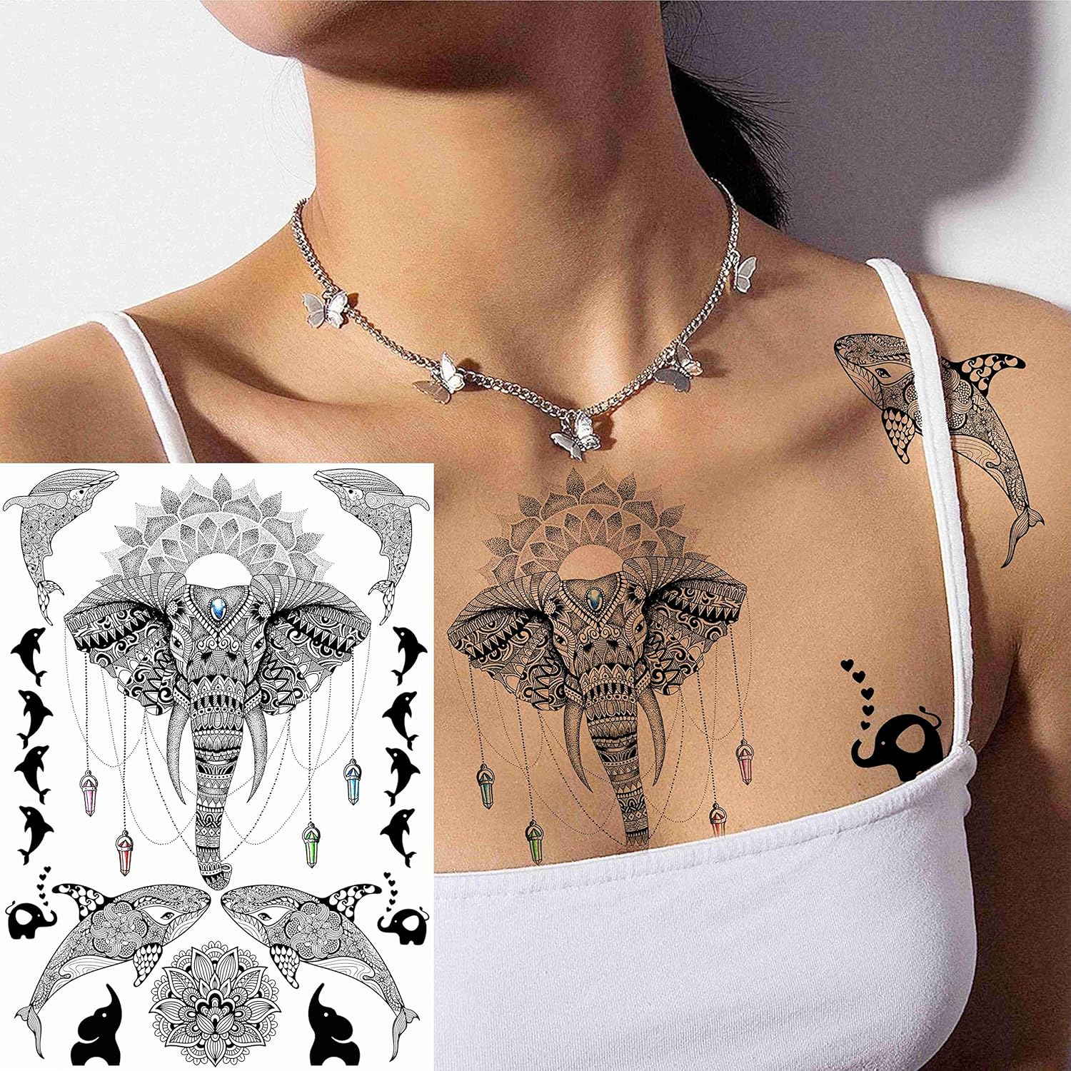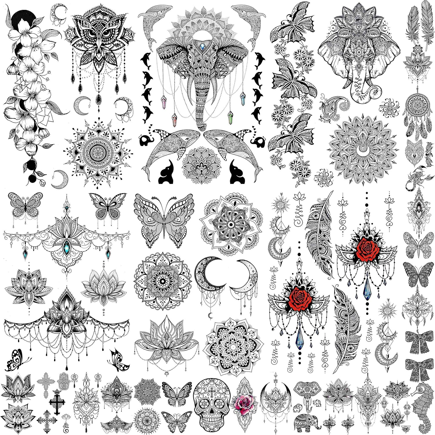 - 🍷28 Sheets Temporary Tattoos Sticker Fashion Designs🍸 EGMBGM Brand Original Tribal Elephant Owl Lord Gothic Ganesha Whale Moon Mandala Flower Feather Butterfly Rose Lotus Fake Jewelry Jewels Flower Floral Bracelets Crown Chains Dolphin Pendants Designs Temporary Tattoos For Adults. There Are 6 Sheets Large Temporary Tattoos In Each Package Of Big Size 21x15cm 8.2"X5.9" and 22 Sheets 10x6CM 4.1"x2.3" Small Temporary Tattoos For Women Kids Daughters Son Children.