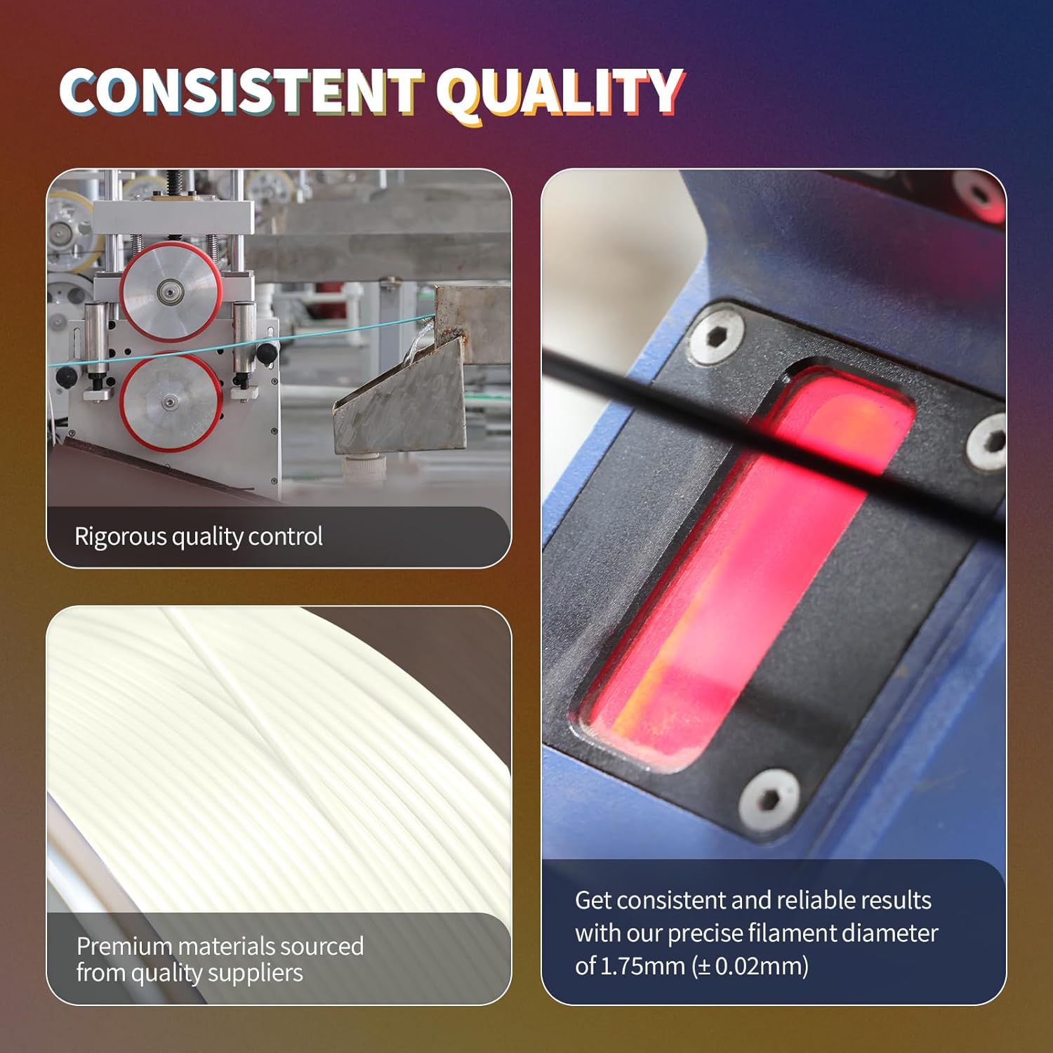 - 【Dimensional Accuracy & Consistency】 Utilizing CCD cameras and closed-loopcontrols, we continuously monitor and adjust the extrusion process in rea-time.Our advanced technology and meticulous control measures guarantee a filamentdiameter of 1.75mm with a tolerance of +/- 0.02mm