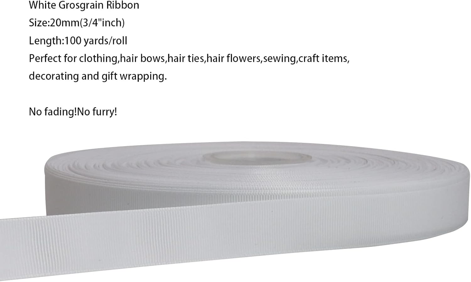 Jesep One Roll 100 Yards 3/4" Soild Grosgrain Ribbon Boutique Gift Wrapping Package Ribbon, DIY Crafts Bow Hair Headband Accessories Assorted Ribbon#29 (3/4" 20mm, White)