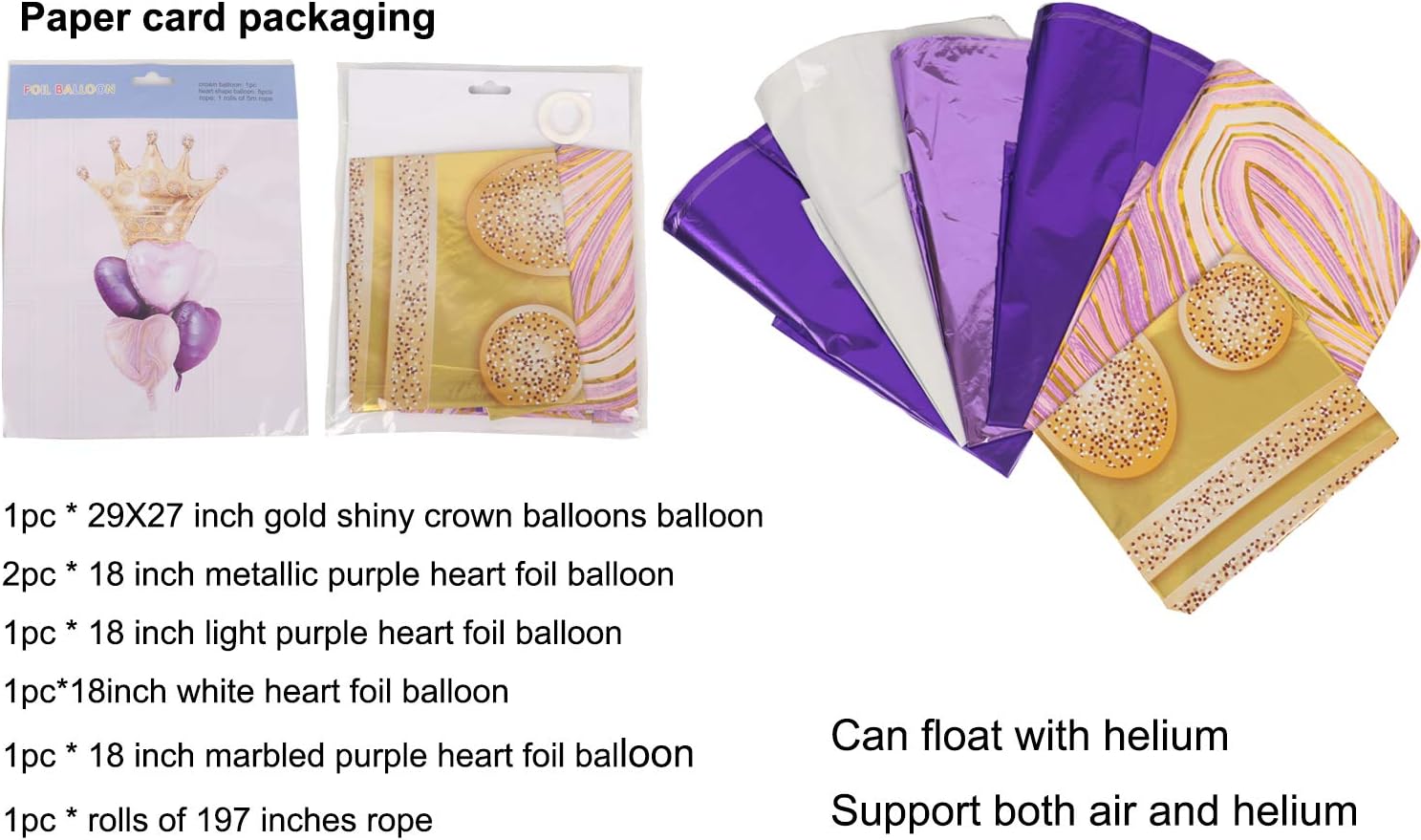 - ♥Good collocation:Our balloons include 1pcs 29*27 inch big golden crown balloons,1pcs 18inch agate marbled purple love balloons,2pcs light purple heart balloons,2pcs 18inch metallic purple balloon.