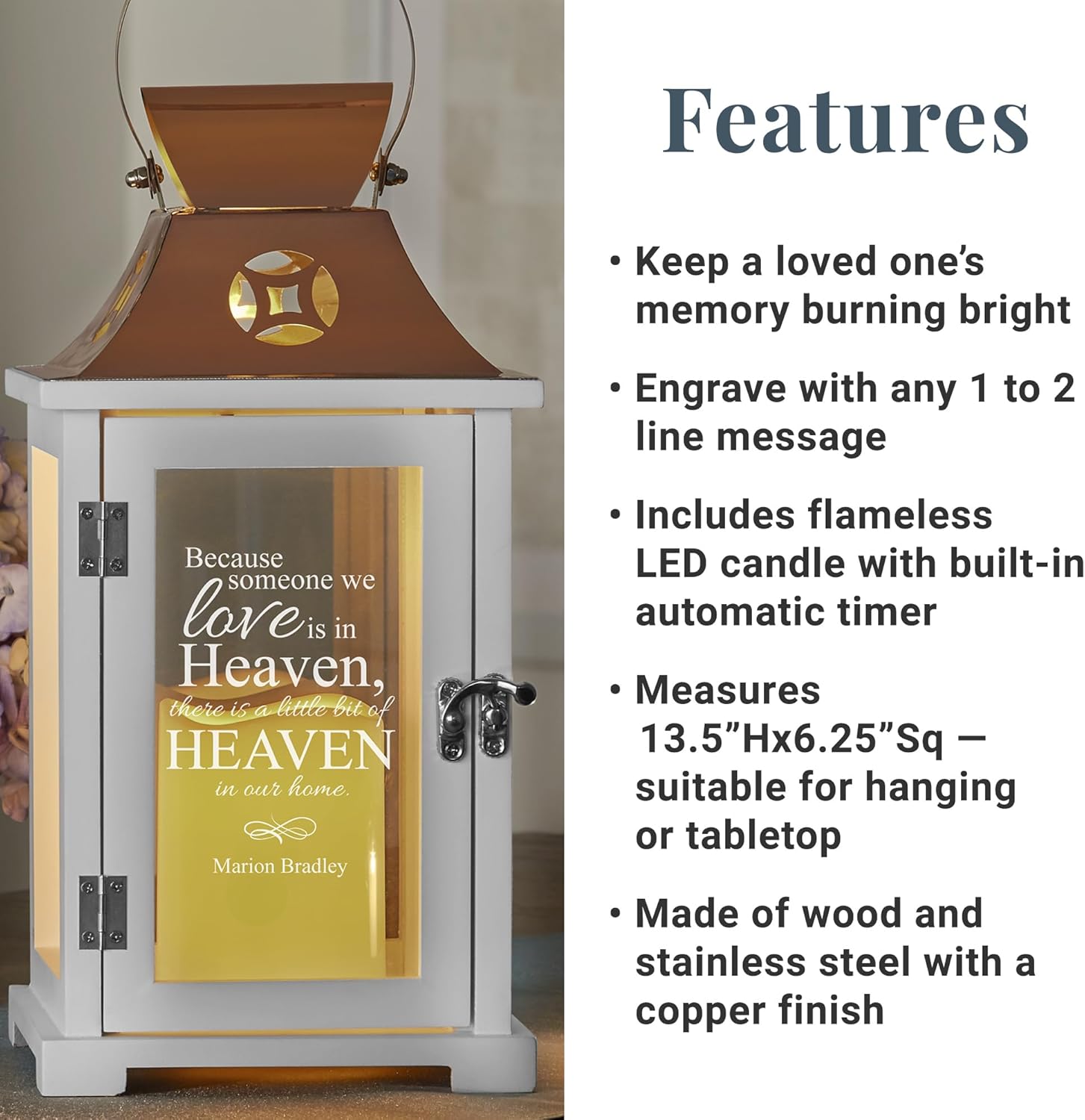 - UNIQUELY PERSONALIZED: Give a memorial gift that's one-of-a-kind. Personalize this charming lantern with any 1- or 2-line engraved message up to 18 characters each. This sentimental gift will be universally treasured.
