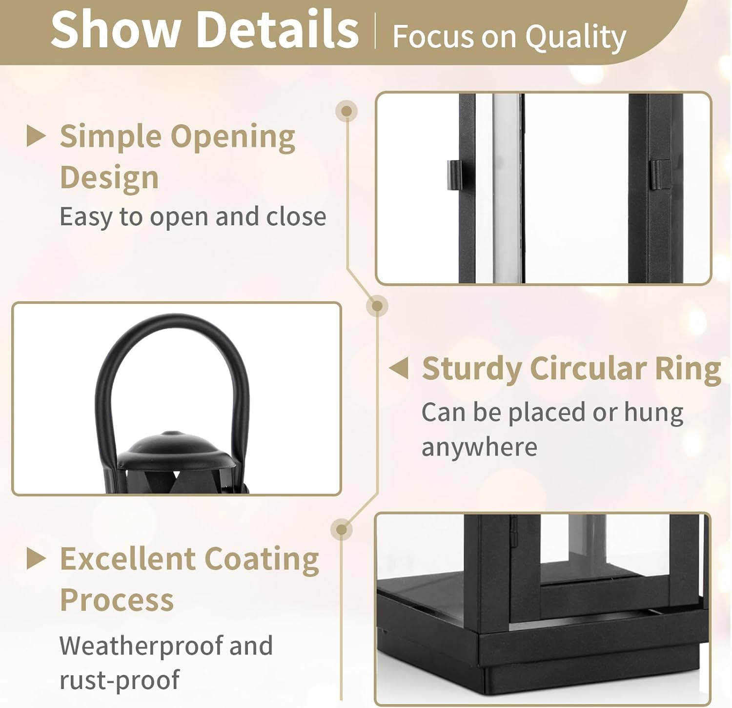 - HANGING & SITTING: Our lantern comes with a sturdy metal ring for easy hanging; also its flat base allow it sit on a flat surface. Serves as lighting and decoration for yard, wall, pathway, driveway, shelf, table, bars, photo booths, patio, porch, etc.