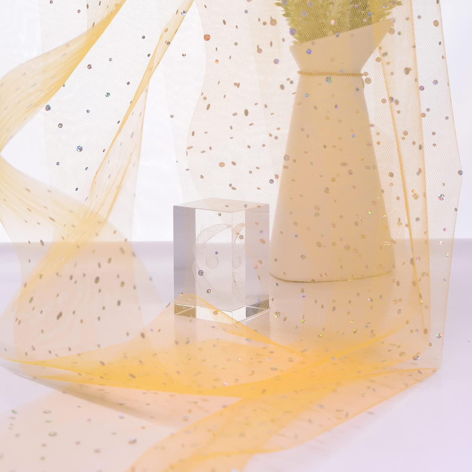 - 🎀【Premium Material】Made of 100% Soft Polyester, flexible diamond netting, lightweight / fine glitter tulle bolt, The fabric is easy to shape and use. Just cut the length you want to decorate. Tulle doesn't require stitching or finishing, it won't unravel!