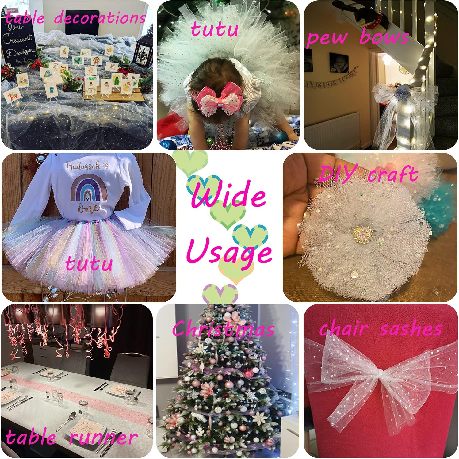 - 🎀【DIY Application】The tulle fabric is great to make making tutu skirts dress, present wrapping, wreath decoration, craft projects, party favors or costume making, hair bows, headwear, chair sashes, sewing, table decorations. Perfect gifts Packaging for Christmas, Valentine's Day, Easter, New Year!
