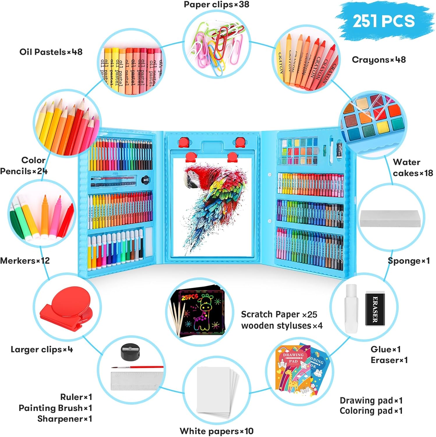 - iBayam KIDS ART KIT: This 251-piece drawing kit includes 1 iBayam Inspiration Art Case, 48-Oil pastels, 47-Paper clips, 48-Crayon, 24-Colored pencils, 25-Scratch Paper, 18-Water color cakes ,12-Water color pens, 10-A4 White papers, 4 x wooden styluses, 4-Larger clips, 1-Drawing pad, 1-Coloring book, 1-Palette, 1-Sketch pencil, 1-Paint brush, 1- Pencil sharpener, 1- Ruler, 1-Eraser, 1-Glue, 1-Ponge.