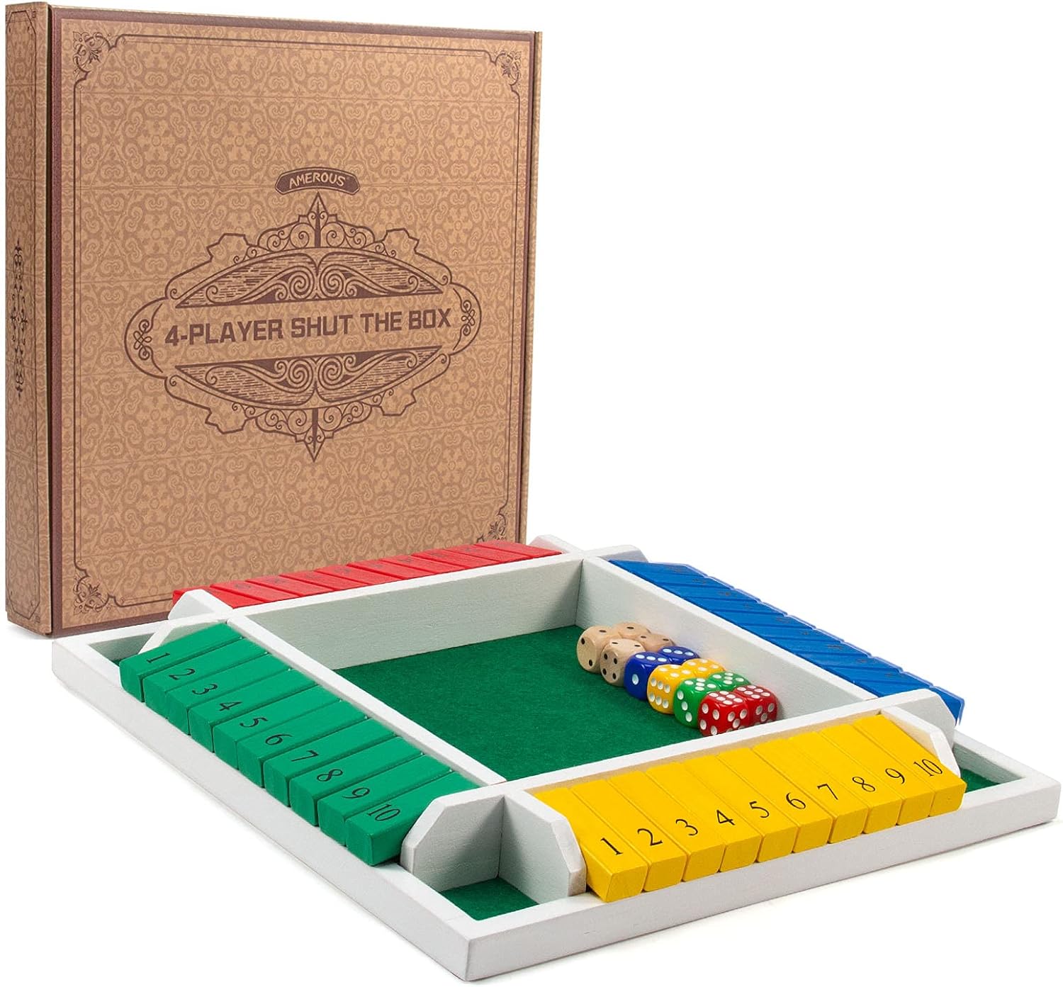 - CLASSIC SHUT BOX GAME - This wooden shut the box game is a classic traditional dice game, open board game for lasting fun for you and your family, friends. It can be completed from 1 to 10 Number combination, 8+4 dice, perfect for 2, 3 or 4 players to play together, is one of the most popular math games today