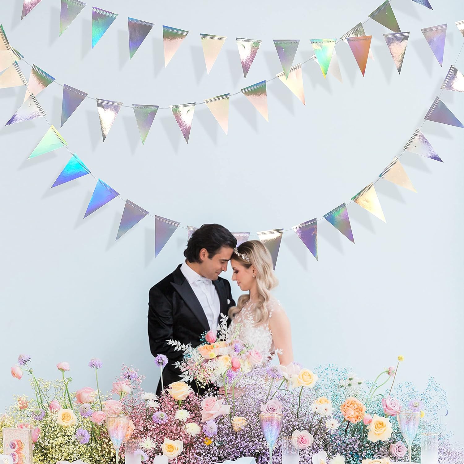 - HIGH QUALITY- -Our iridescent triangle flag buntings are made of high quality double sided metallic holographic paper, different light will reflect different colors.Bling bling shining make the atmosphere of your decor more perfect.