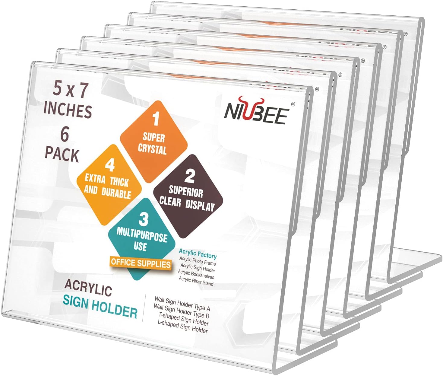 - STABLE AND STURDY - Made from 2mm thickness crystal clear acrylic with wide stable base, NIUBEE acrylic display stand supports long-lasting strength and use. Wide flat base allows free-standing vertical presentation of inserts, keeps the unit stable on counters, tables, desktops etc.