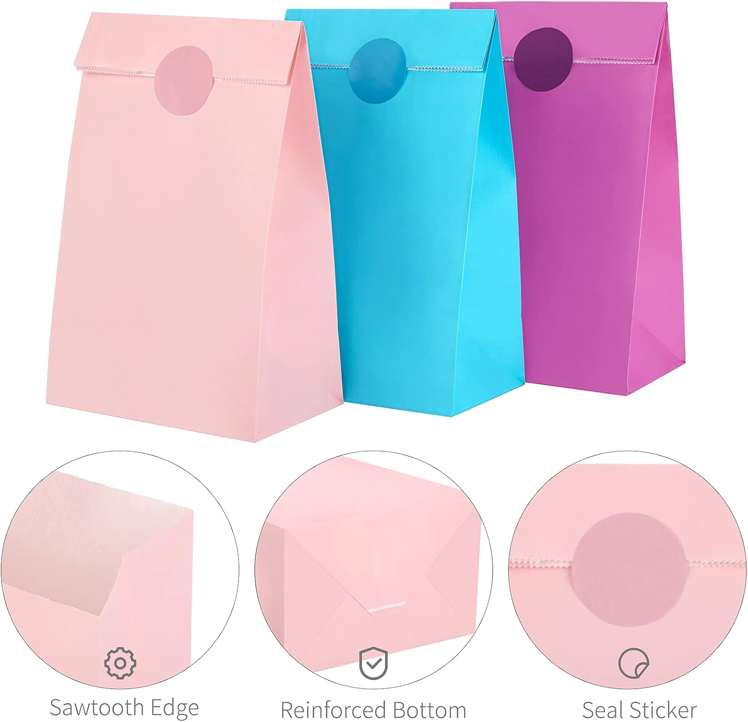Cooraby 30 Pieces 5.1 x 3.1 x 9.4 Inches Colorful Kraft Paper Bags with 48 Stickers Party Treat for Wedding, Celebration, Birthday Party Supplies (Sky Blue, Light Purple, Pink)