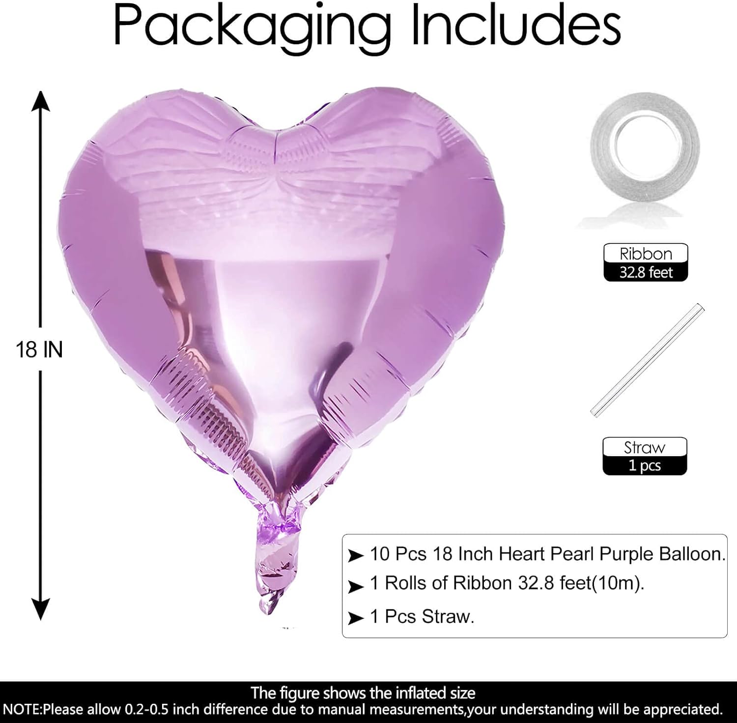 - Package Included:10Pcs 18 inch Pearl Purple Heart Balloons (uninflated) + 1pcs Straw +1pcs 32 foot Ribbon Roll
