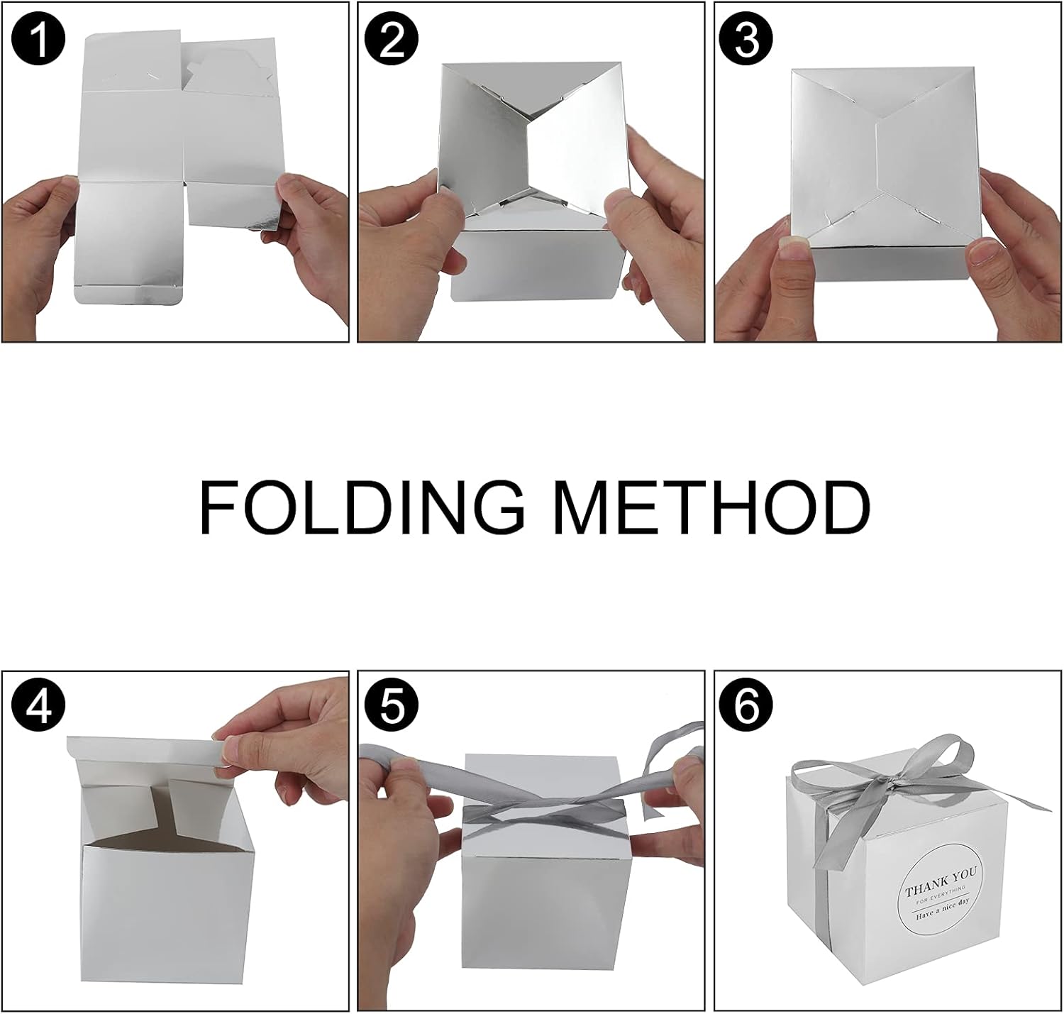 - What You'll Get: 60pcs Silver favor boxes,60pcs silver ribbons and 60pcs Thank you stickers. you can tie a bow knot on top, which will be more elegant and romantic for party.