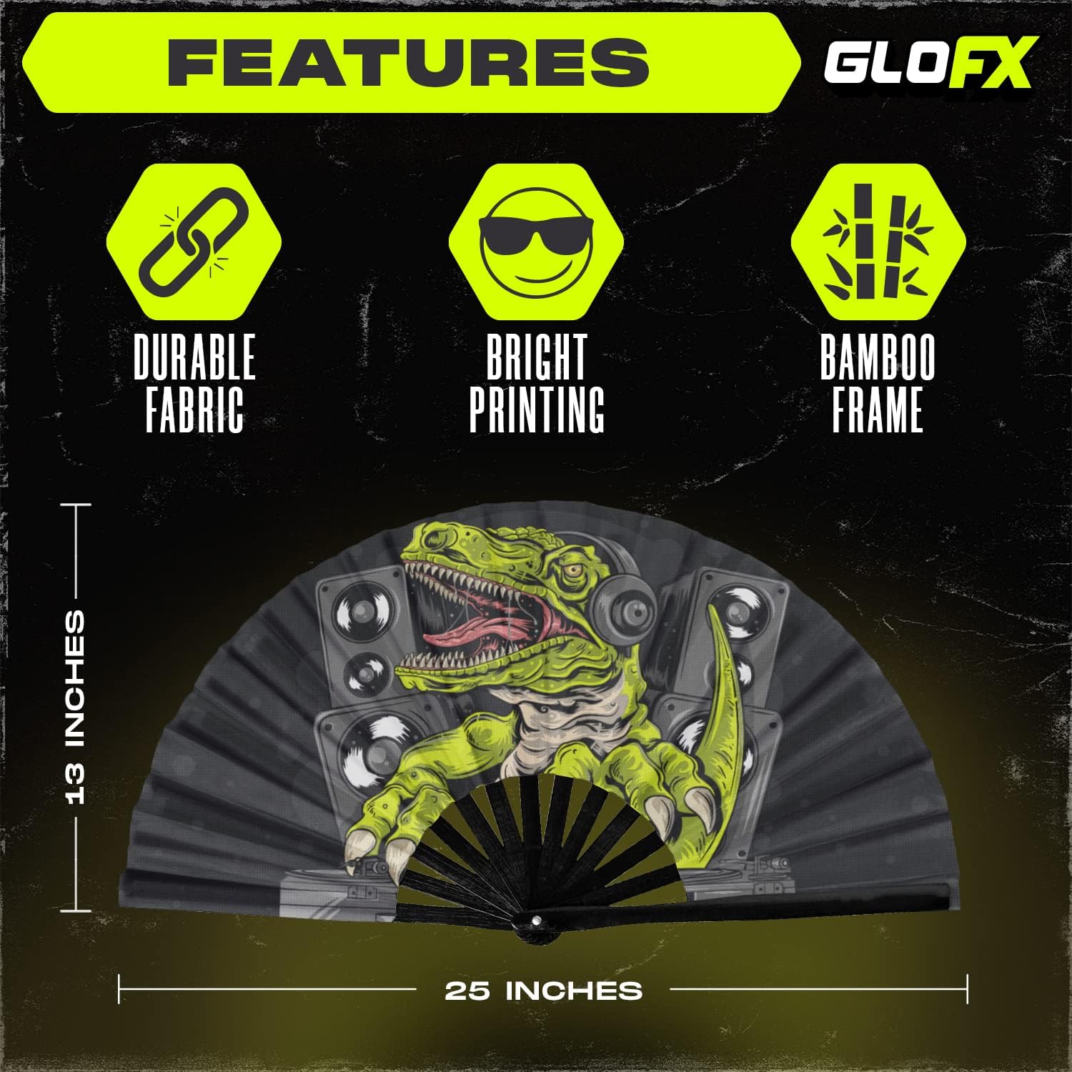 - DJ DINO DESIGN: Rock the party with our GloFX Folding Fan featuring a DJ Dino design. This fun and lively pattern adds a playful touch to your ensemble, making it the perfect accessory for EDM events, music festivals, raves, clubs, parties, dances, performances, and beyond.