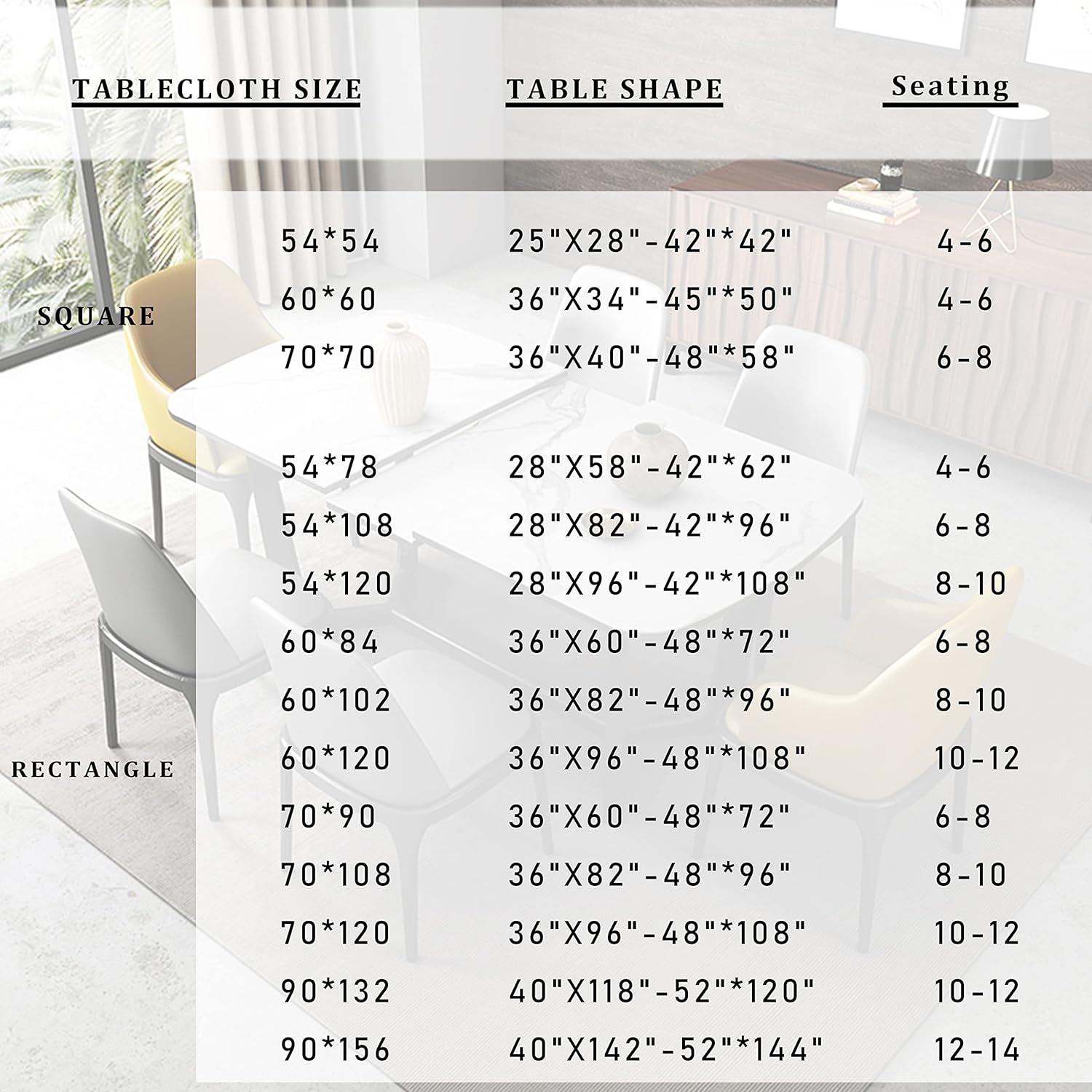 - MEASUREMENTS: This table cloth is available in various sizes: 54x54 inch, 54x78 inch, 54x108 inch, 54x120 inch, 60x60 inch, 60x84 inch, 60x102 inch, 60x120 inch, 70x70 inch, 70x90 inch, 70x108 inch, 70x120 inch, 90x132 inch, 90x156 inch. Please measure the size before purchasing.
