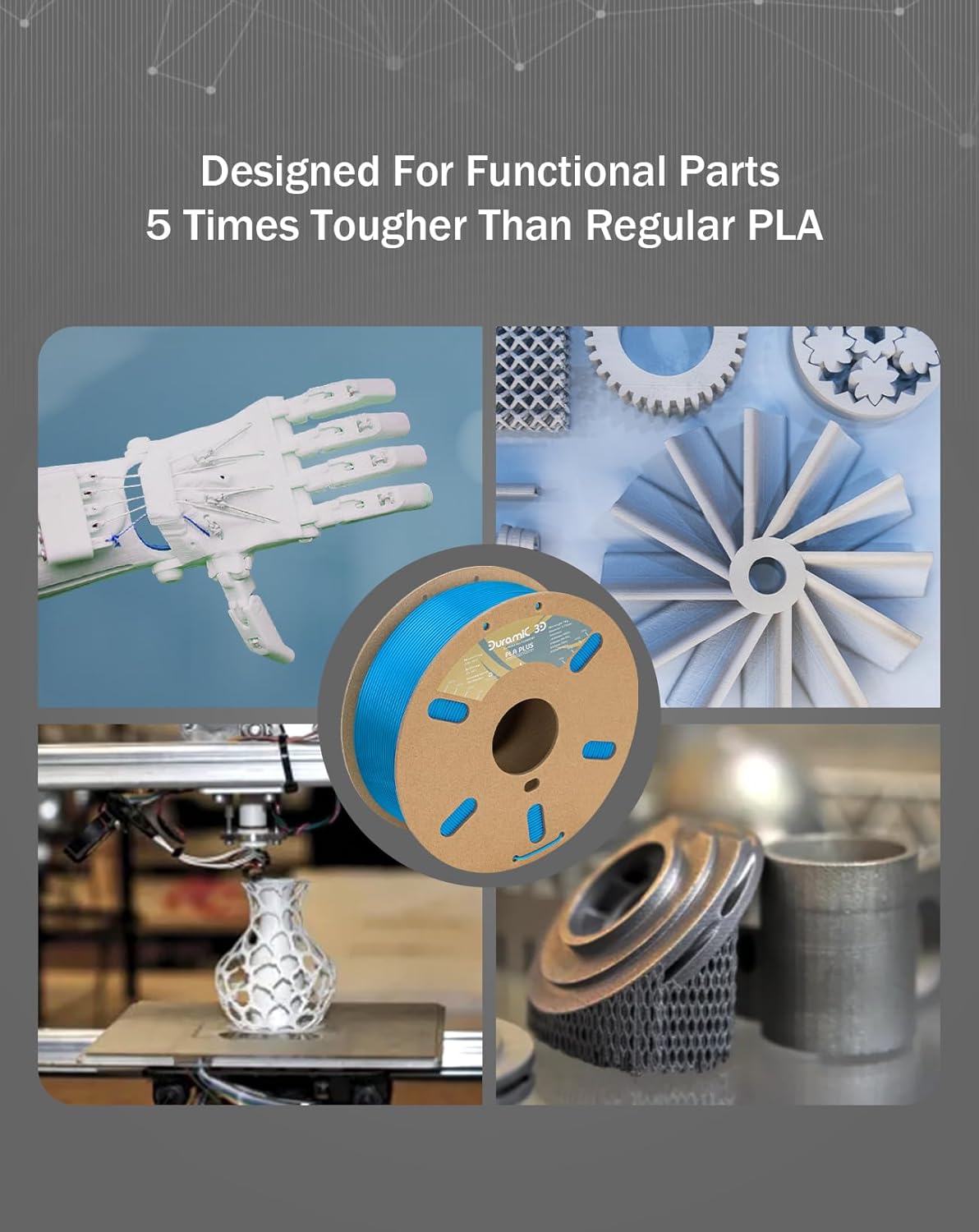 - JAM-FREE& SMOOTH PRINTING: Duramic 3D PLA plus filament features unique patented Jam-free technology and 100% vacuumed package in resealable with desiccant, which makes no room for clogging and bubbling