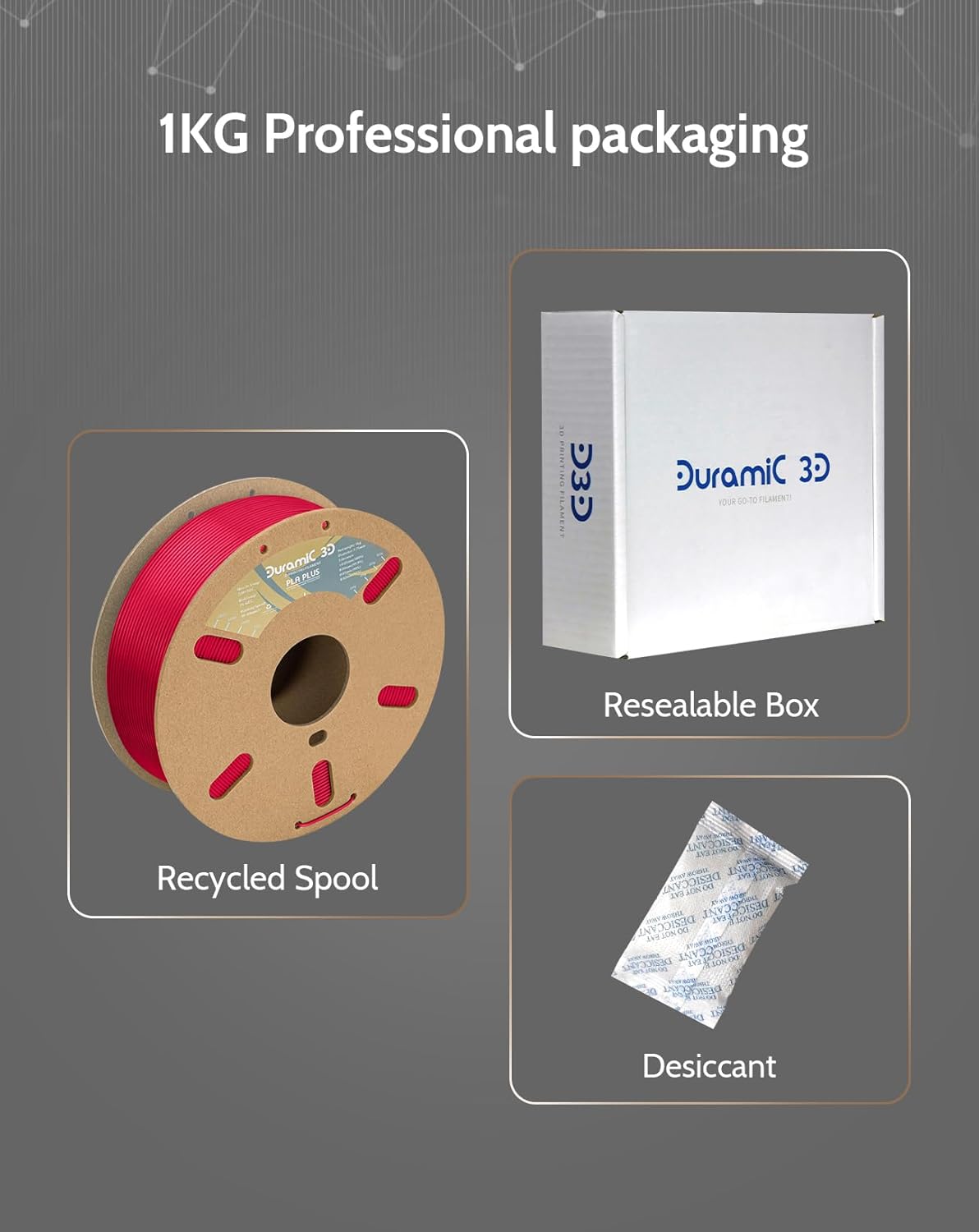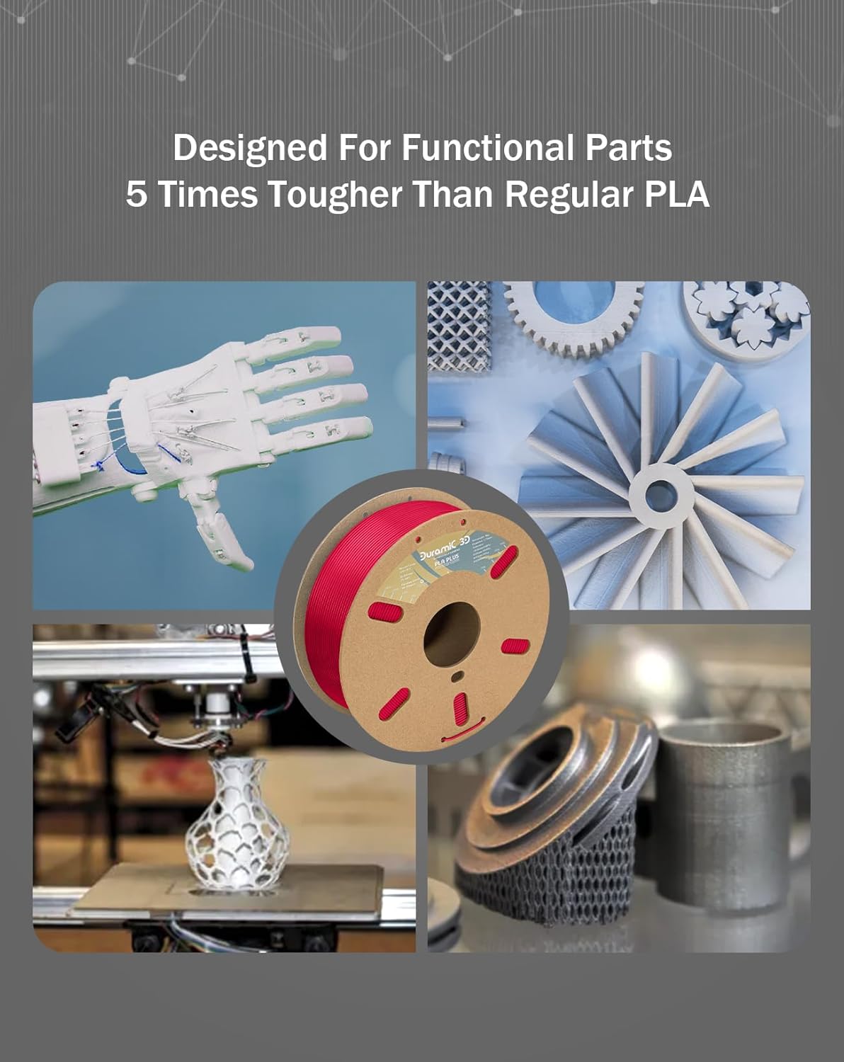 - JAM-FREE& SMOOTH PRINTING: Duramic 3D PLA plus filament features unique patented Jam-free technology and 100% vacuumed package in resealable with desiccant, which makes no room for clogging and bubbling