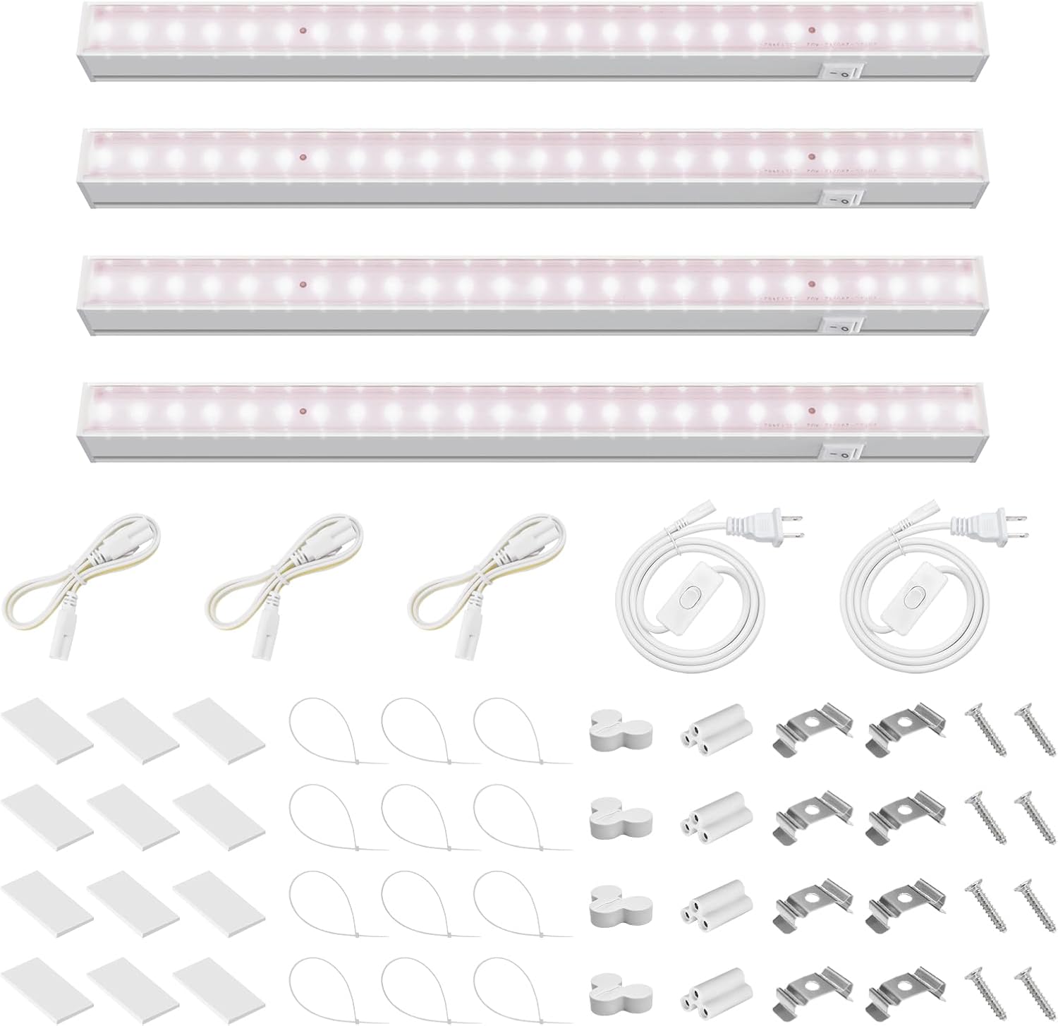 - What You Get: 4 x Barrina T5 Grow Lights, 2 x Power Cords with ON/OFF Switch, 4 x Connecting Cords(20''), 4 x Small Connectors, 8 x Installation Clips, 12 x Double-sided Tapes, 12 x Cable Ties