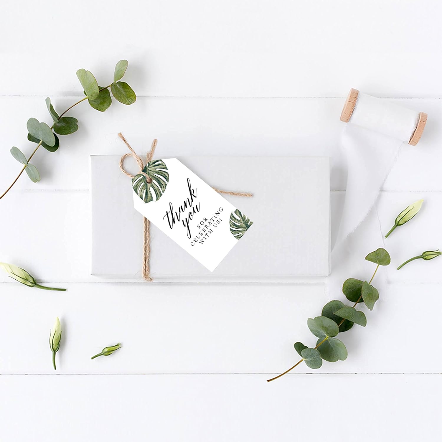 Andaz Press 100-Pack Thank You for Celebrating with Us Favor Tags Tropical Monstera Leaves Cardstock Gift Tags with Bakers Twine for Wedding Baby Shower Bridal Shower Party Favors 2 x 3.75-Inches
