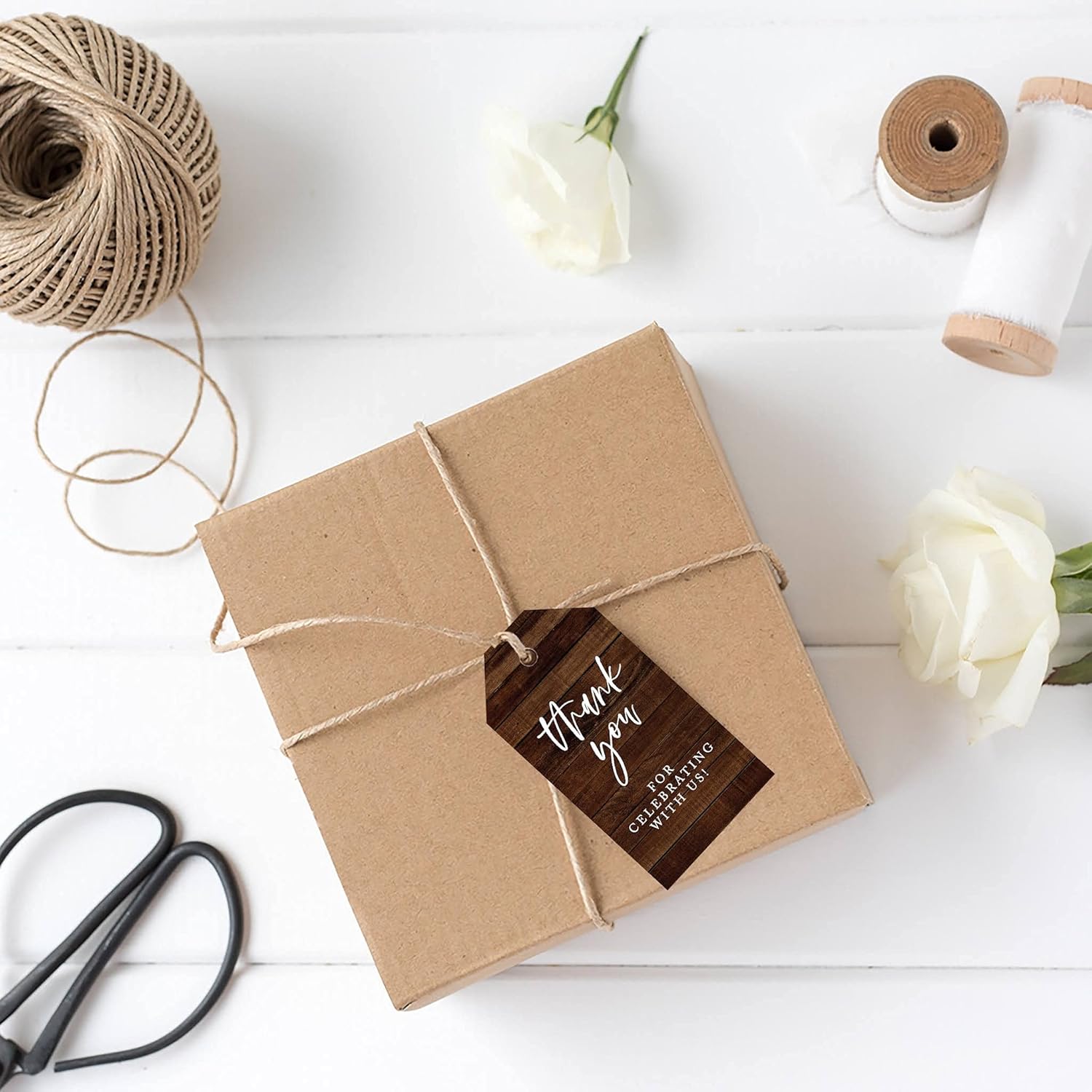 Andaz Press 100-Pack Thank You for Celebrating with Us Favor Tags Rustic Wood Cardstock Gift Tags with Bakers Twine for Wedding Baby Shower Bridal Shower Birthday Holiday Party Favors 2 x 3.75-Inches