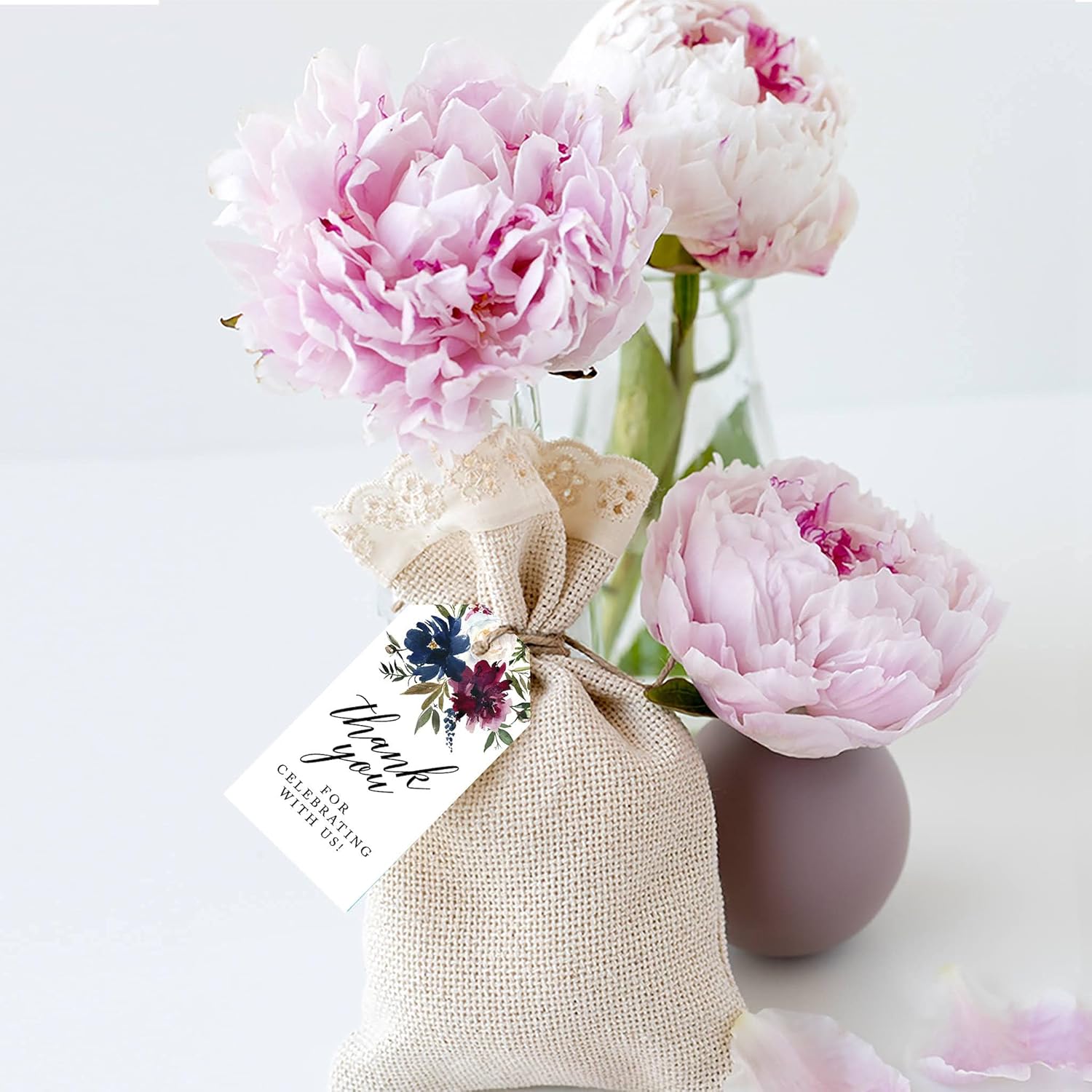 Andaz Press 100-Pack Thank You for Celebrating with Us Favor Tags Navy Blue Burgundy Florals Cardstock Gift Tags with Bakers Twine for Wedding Baby Shower Bridal Shower Party Favors 2 x 3.75-Inches