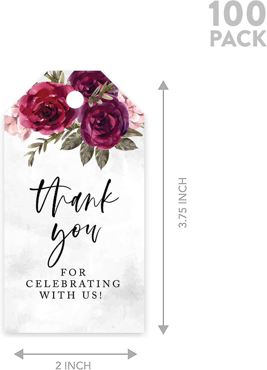 Andaz Press 100-Pack Thank You for Celebrating with Us Favor Tags Burgundy Florals Cardstock Gift Tags with Bakers Twine for Wedding Baby Shower Bridal Shower Birthday Party Favors 2 x 3.75-Inches