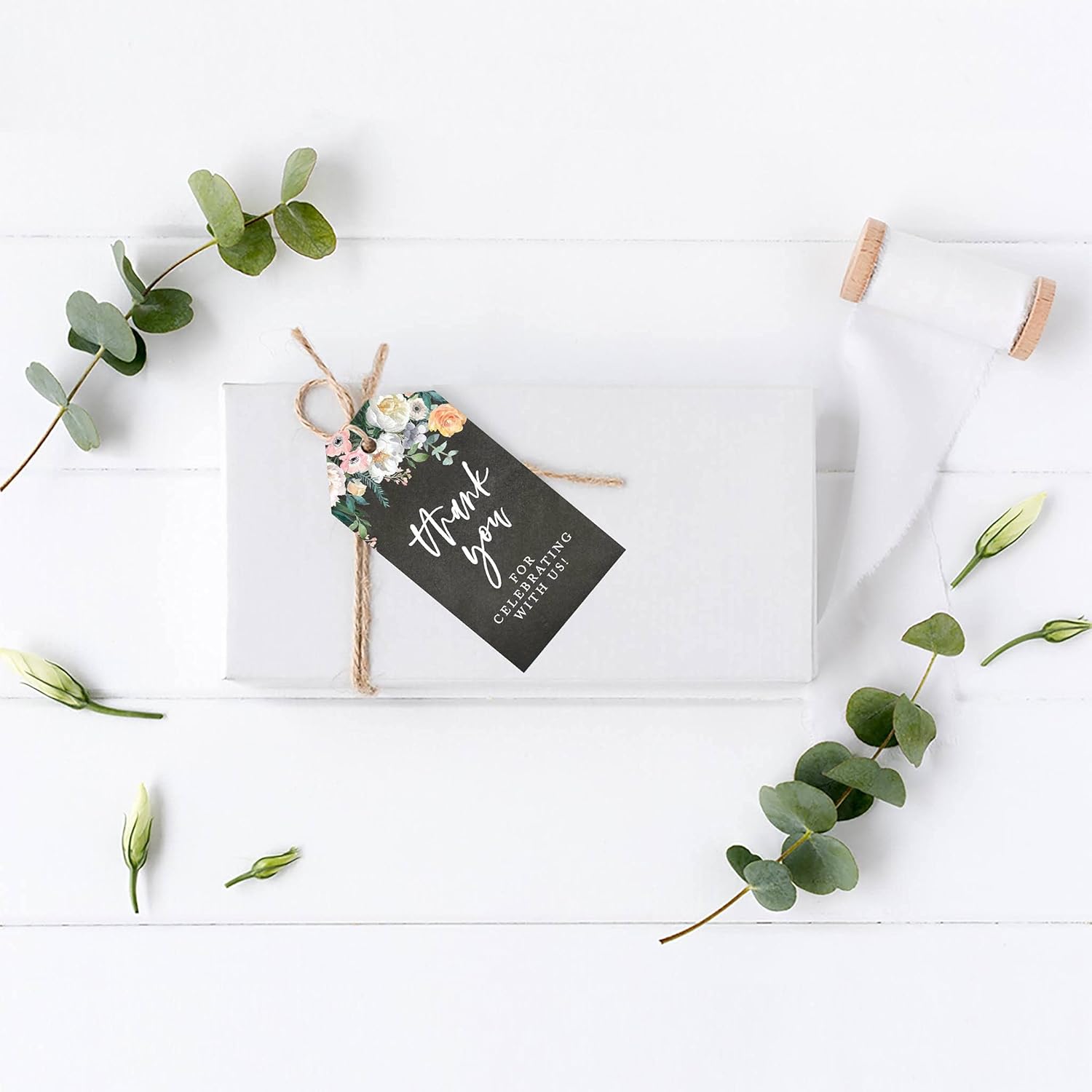 Andaz Press 100-Pack Thank You for Celebrating with Us Favor Tags Chalkboard Florals Cardstock Gift Tags with Bakers Twine for Wedding Baby Shower Bridal Shower Birthday Party Favors 2 x 3.75-Inches