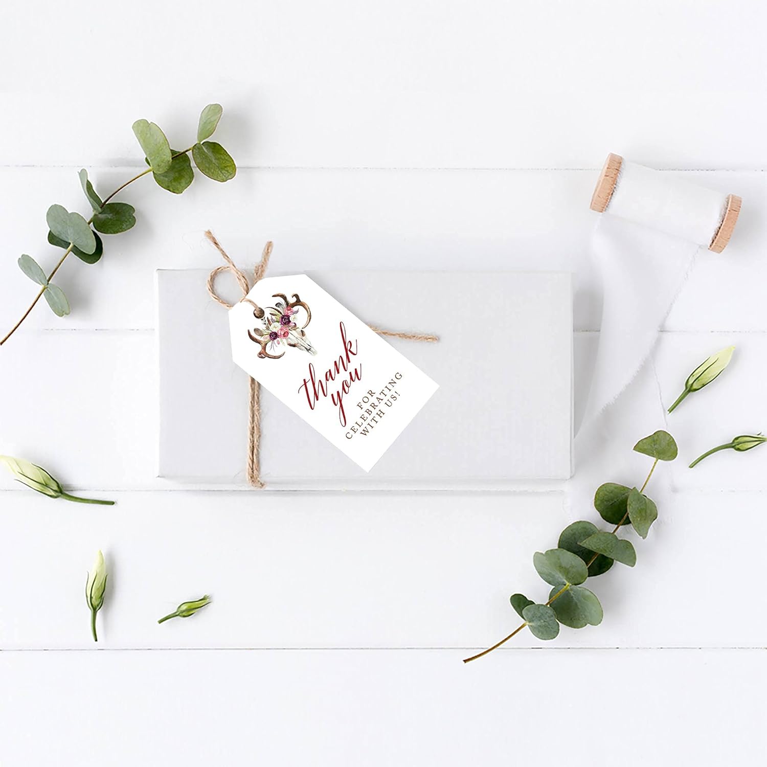 - FOR OTHER GIFT WRAP TAGS: Giving a thank you gift to those that attended your party is a memorable touch to celebrate your birthday, anniversary, baby shower, wedding, bridal shower, or other special events. Make it more personal with party favor tags that say, "Thank you for celebrating with us". These party tags come with Bakers twine and in 35 unique designs that can match your party theme perfectly. Show guests just how thankful you are they celebrated your special event.