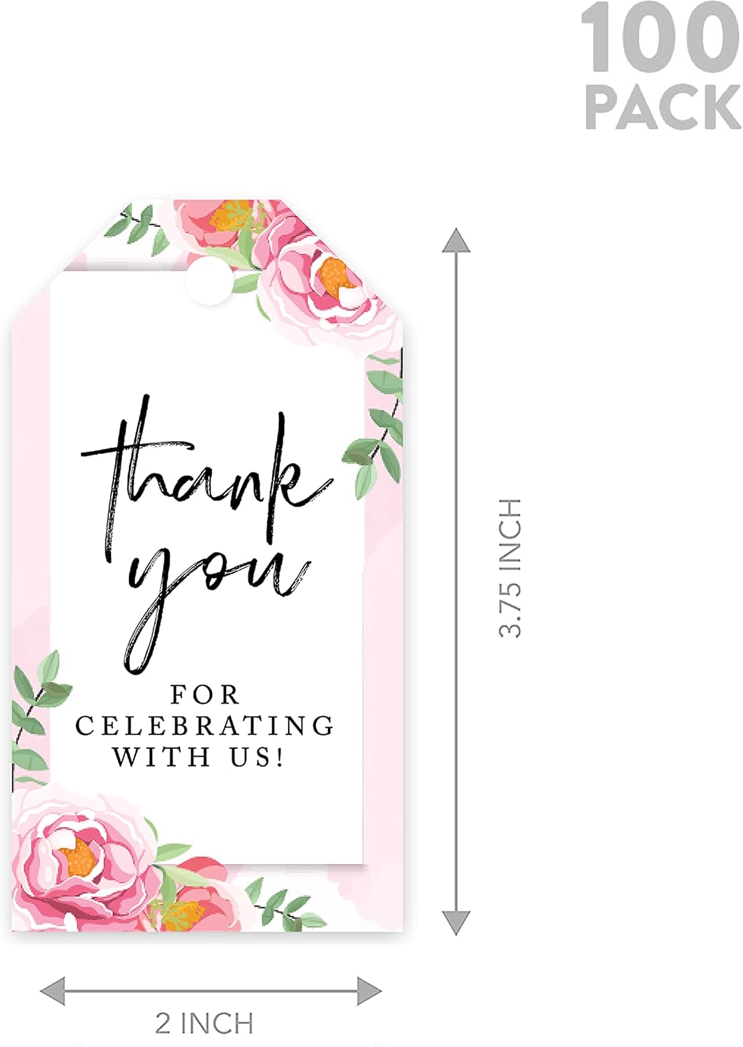 Andaz Press 100-Pack Thank You For Celebrating With Us Favor Tags Pink Peonies Cardstock Gift Tags with Bakers Twine for Wedding Baby Shower Bridal Shower Birthday Holiday Party Favors 2 x 3.75-Inches