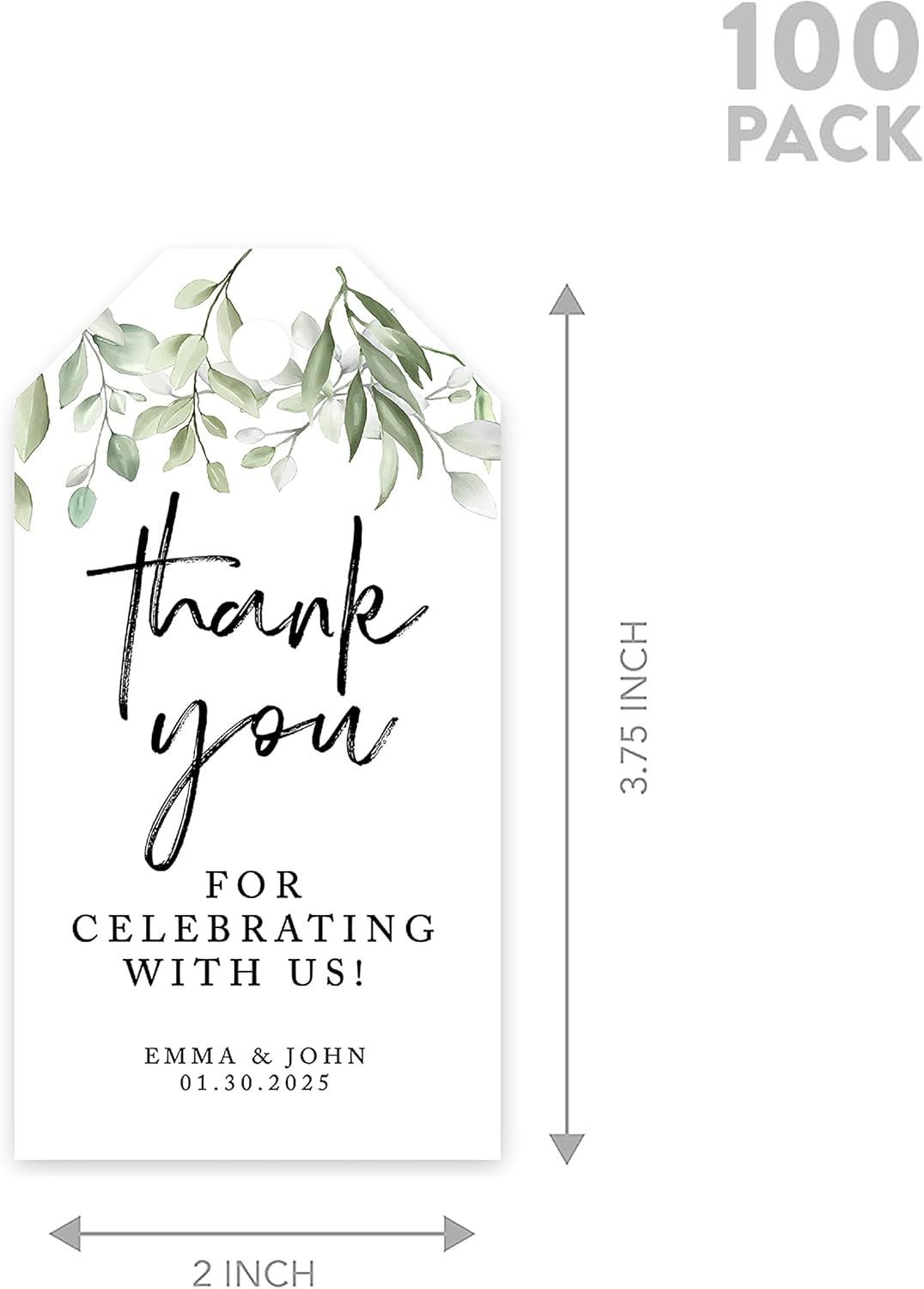 - Personalized Wedding Tags For Favors with Twine: Each tag is 2 X 3.75 inches. Sold as a bulk of 100 tags, personalize your gifts with a small thank you tag for your wedding favors. These personalized wedding favors include a custom couple’s name and date for a tailored touch; suitable for receptions and showers, these customized gift tags complement event décor; pre-punched and paired with twine, these thank you for celebrating with us tag sets offer a cohesive look; these wedding thank you tags are suitable for favor bags, guest gifts, and welcome kits; improve party giveaways with personalized favor tags