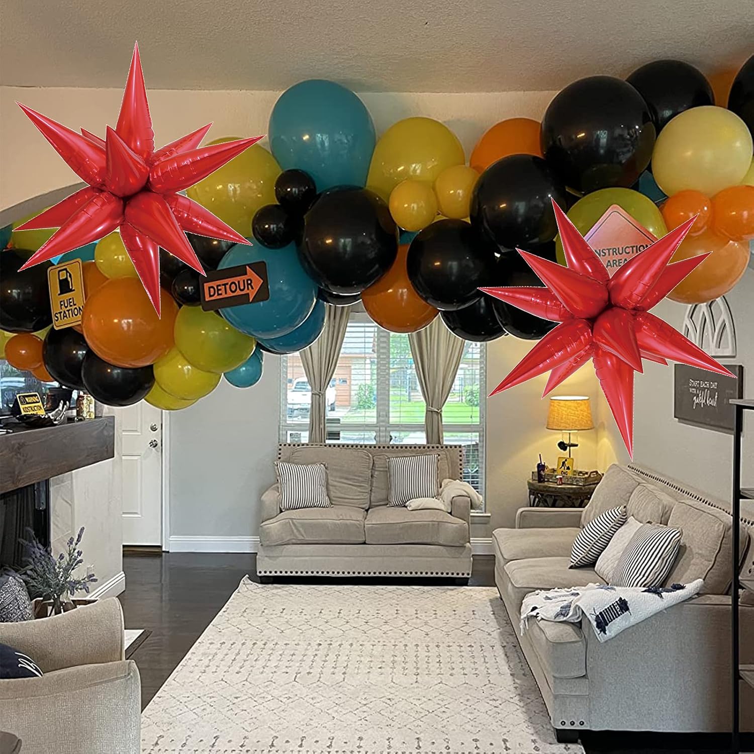 - Star Balloons, Item included 24 pcs drop-balloon, assemble 12pcs drop-balloon into a Star-burst balloon, total 2pcs Starburst balloon