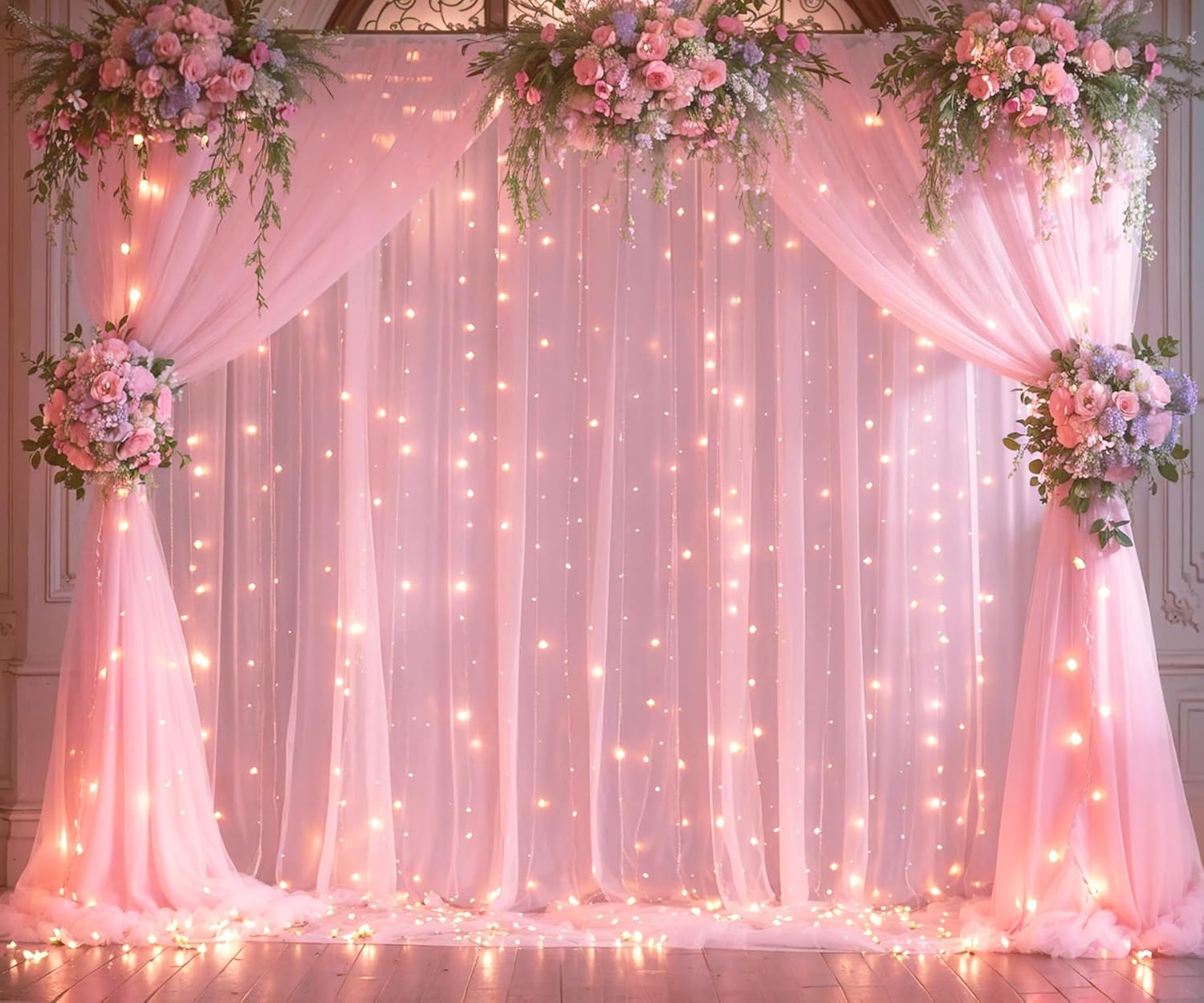 - Products include: 10ft×10ft pink sheer tulle backdrop curtain, a set of 9.8ft warm white string light and 12pcs Transparent clips (no remote control).