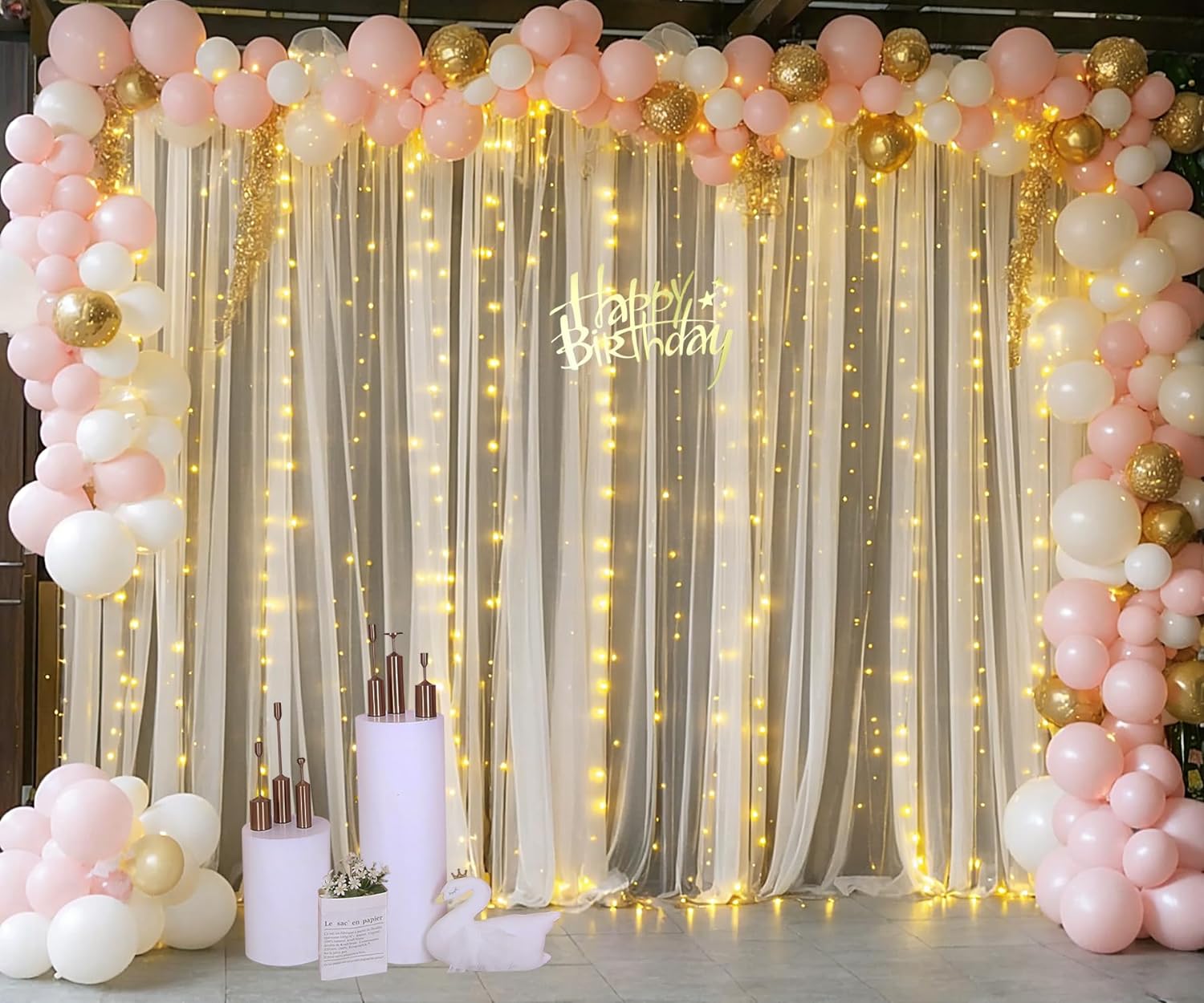 - Products include: 10ftร8ft wrinkle free champagne curtain backdrop, a set of 9.8ft warm white string light and 12pcs Transparent clips (no remote control).