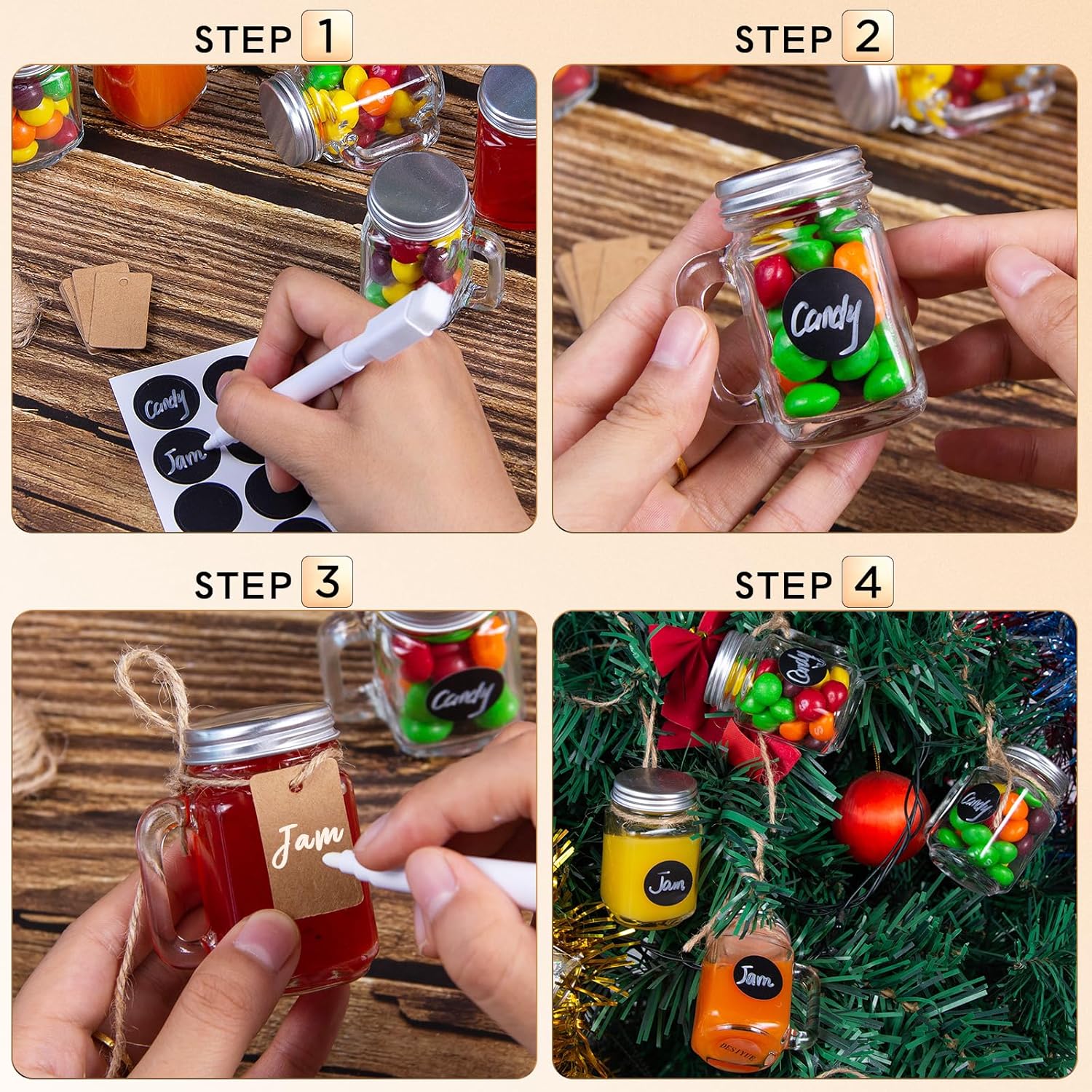 - PACKAGE INCLUDES: 30pack 1.5 oz small glass mason jars,30 Kraft paper tags ,whiteboard pen,equipped with 30 blank chalkboard labels,10M hemp rope. With this set, you will have everything you need to fill and tidy the jar.
