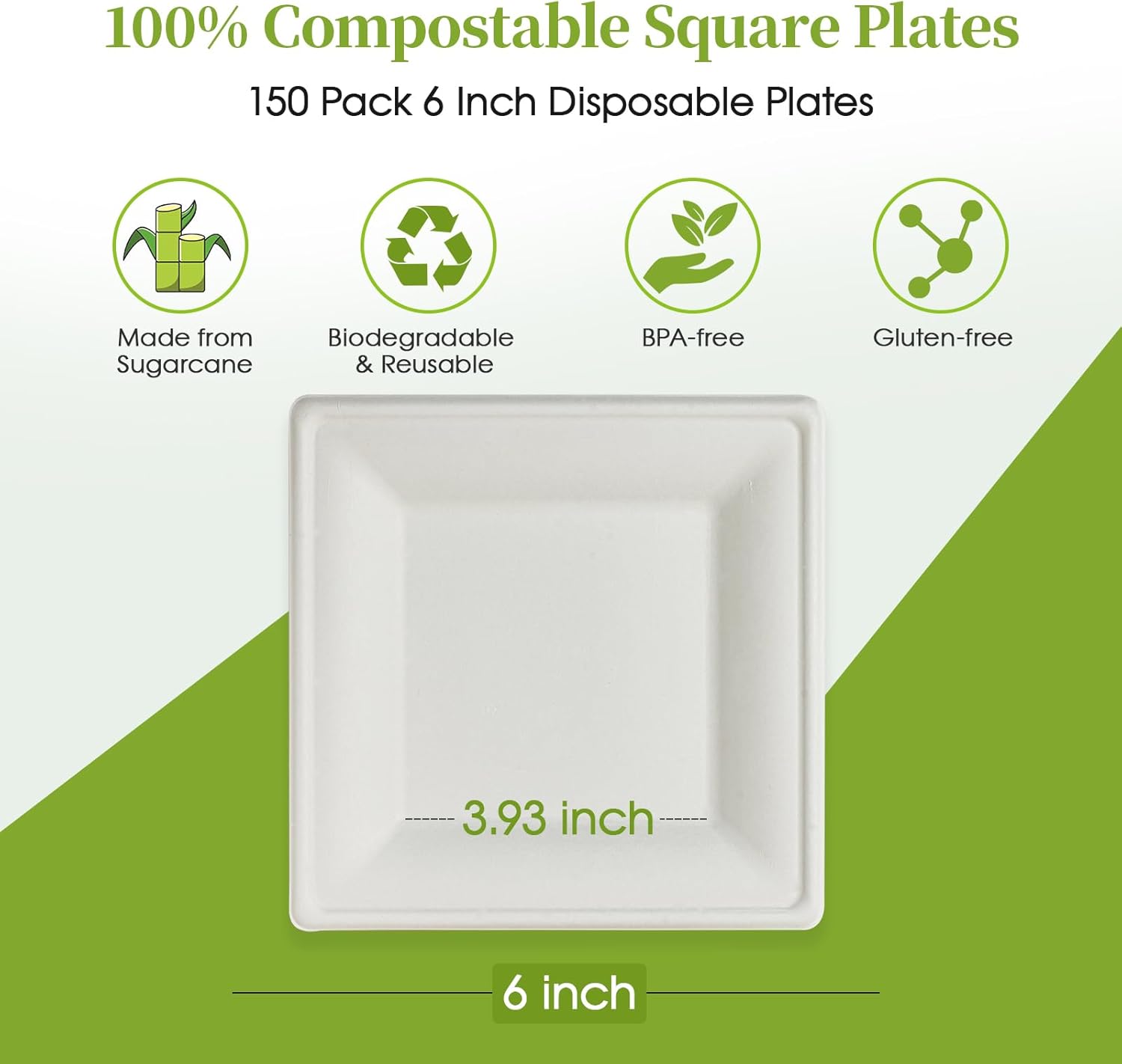 - 6 inch Square Paper Plates: Set includes 150 Pack 100% compostable 6 inch square disposable plates, The simple and atmospheric white sugarcane plates can be matched with any food, perfect for serving sandwiches, salads, baked beans, fruits