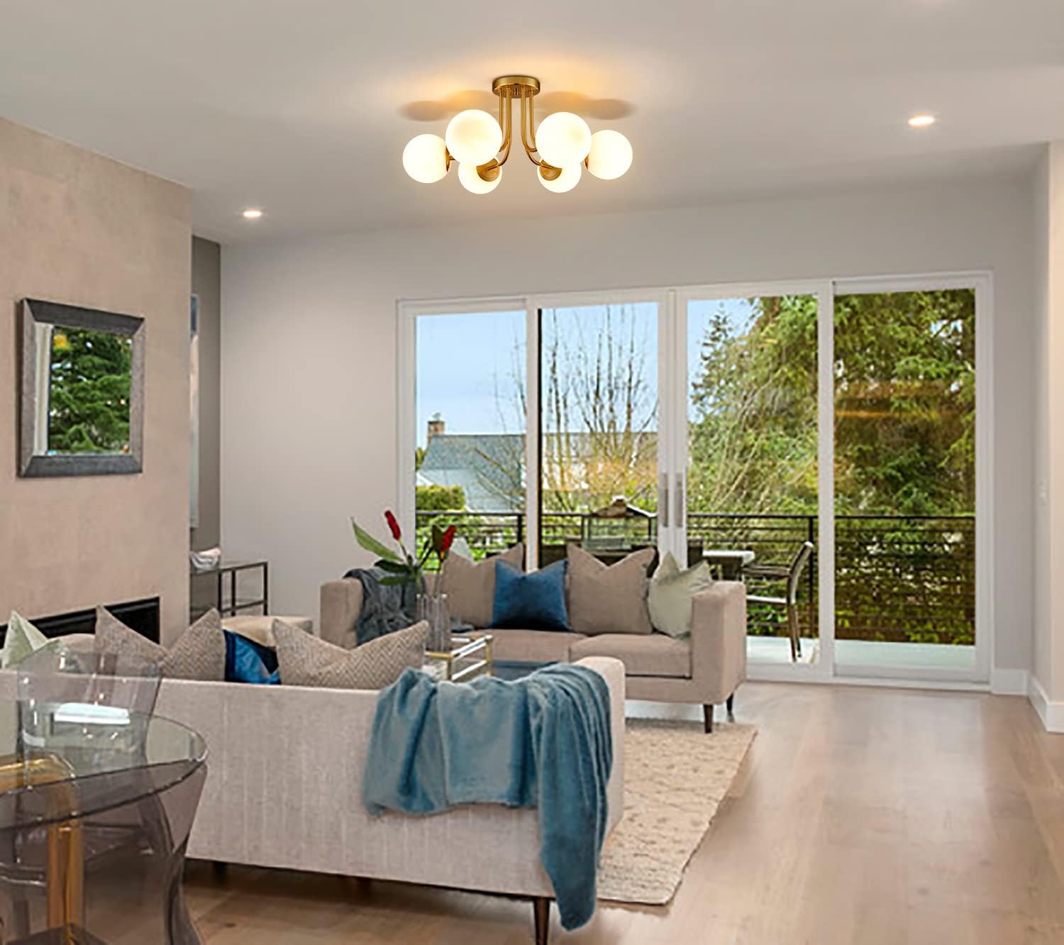 - The 6-light sputnik semi flush mount light fixtures crafted from globe off-white manual blown glass ,combination of electrophoresis brass gold metal finish.It can reflect the sparkling and even lighting ,adds more chic and luxury feeling .The durable material can avoid rust for a long time used.
