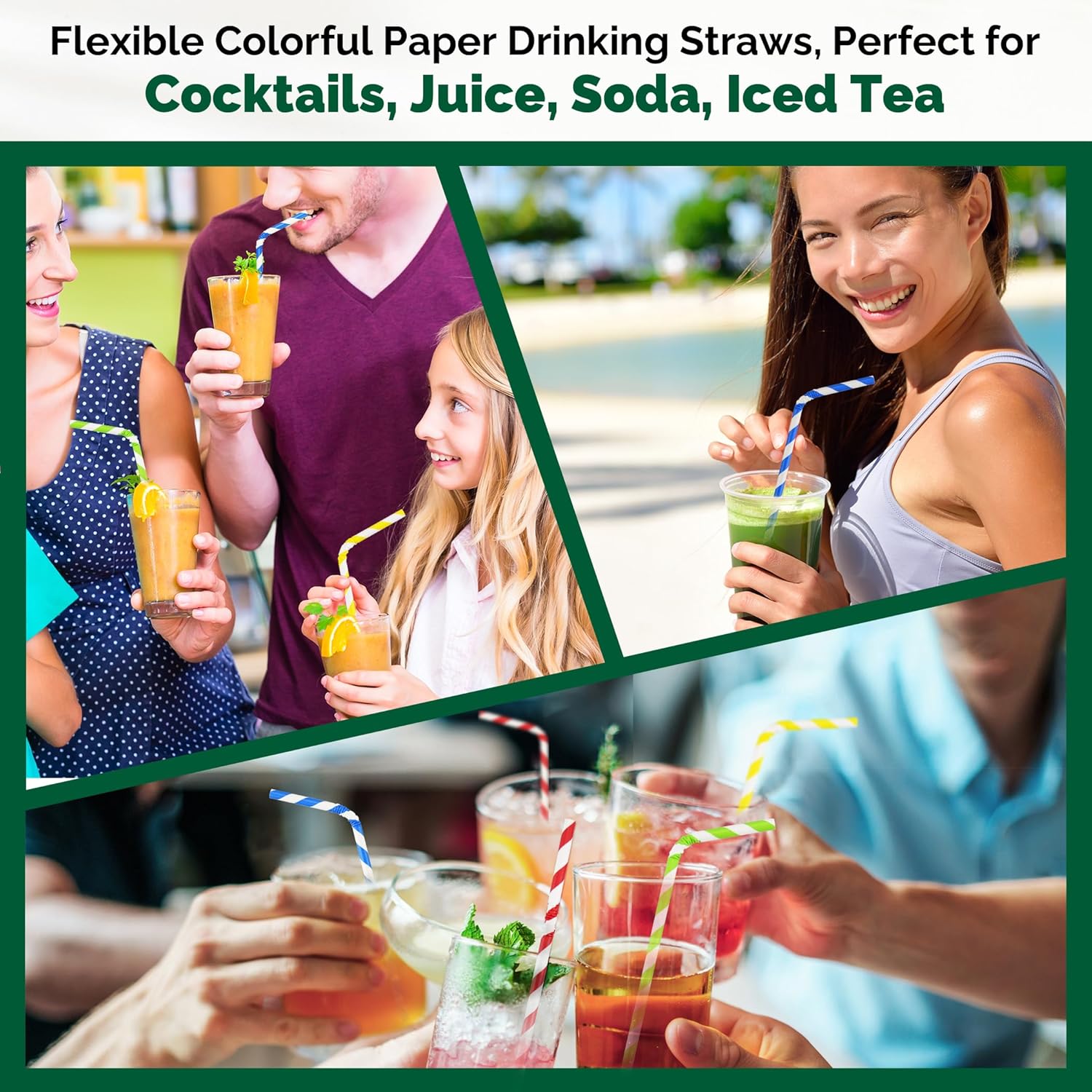 Flexible Paper Drinking Straws, 250 Count, 7.75" Long, 0.24" diameter - 100% Biodegradable - Assorted Striped Colors