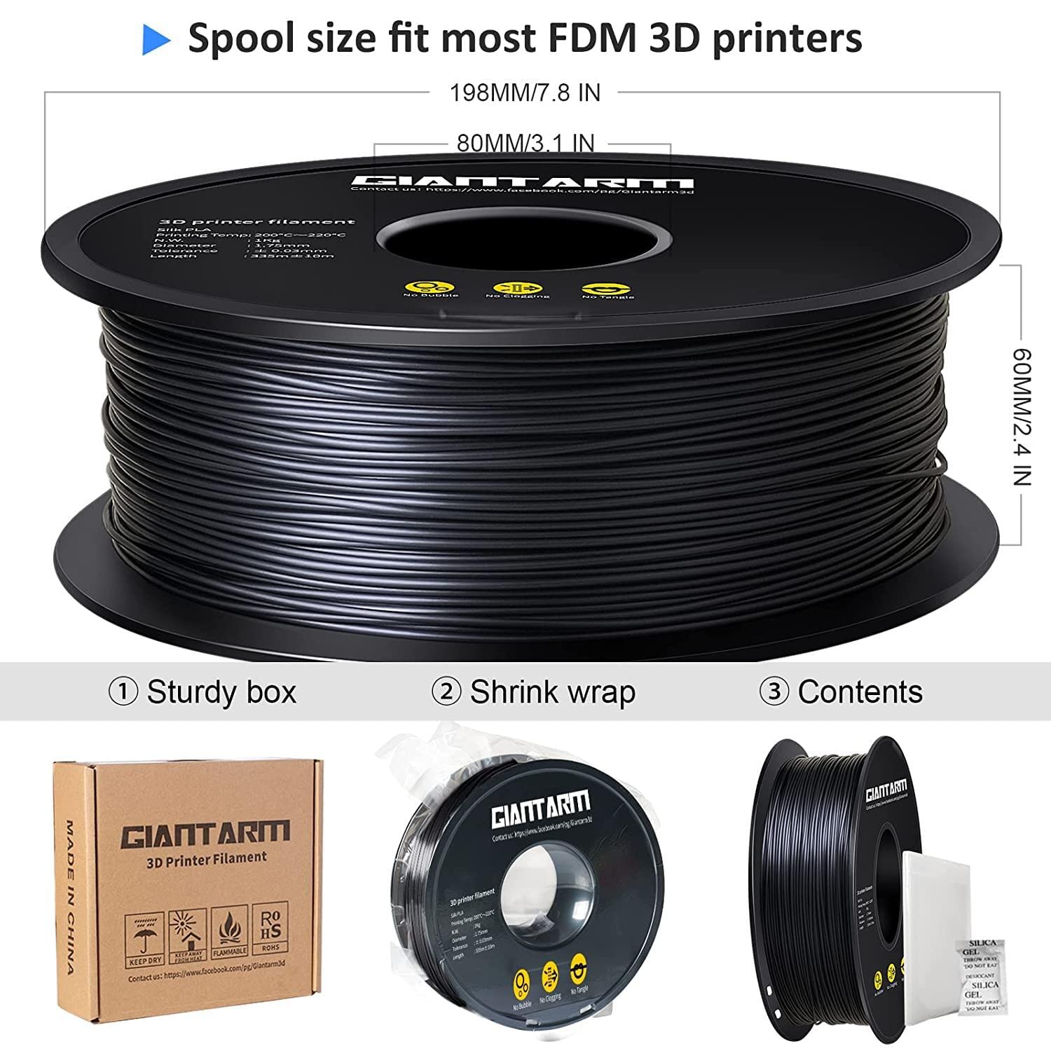 GIANTARM 3D Printer Filament, Silk Black Pla Filament, 1Kg(2.2lbs) Spool, 1.75mm Dimension Accuracy +/- 0.03mm, 3D Printing Filament