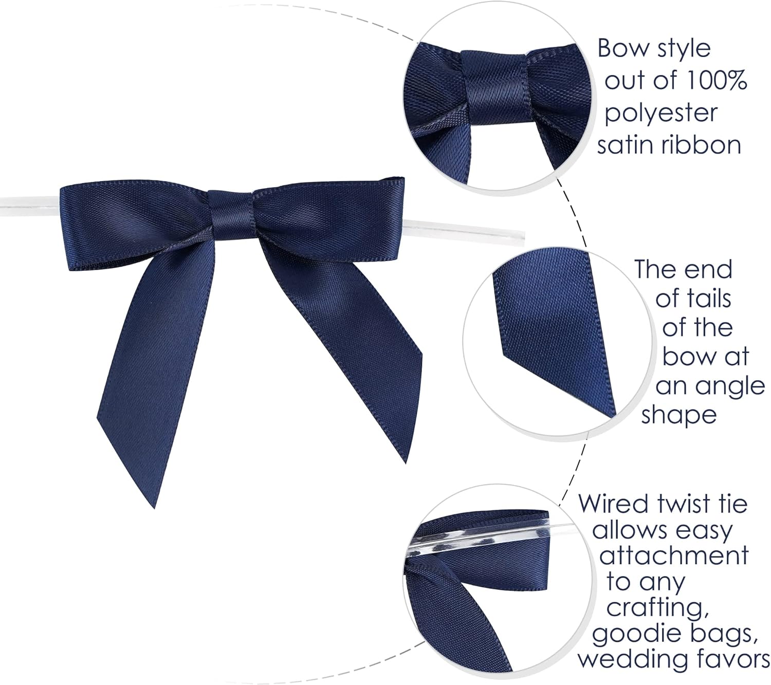 AIMUDI Navy Blue Satin Ribbon Twist Tie Bows 2.5" Pretied Bows Premade Craft Bows for Treat Bags Cake Pop Gift Wrapping Basket Wedding Favors Cookie Candy Bagging Baby Shower - 50 Counts