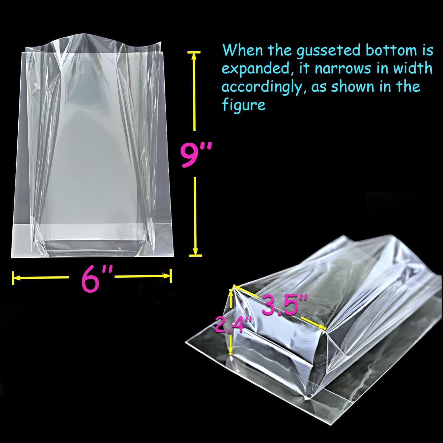 - Extra-Wide 2.4-Inch Gusseted Flat Bottom for Upright, Professional Presentation: Unlike ordinary flat cellophane bags, these 6x9 clear treat bags feature a spacious 2.4-inch gusseted bottom that adds both capacity and structure, allowing the bags to stand upright on their own for a neat, elegant look