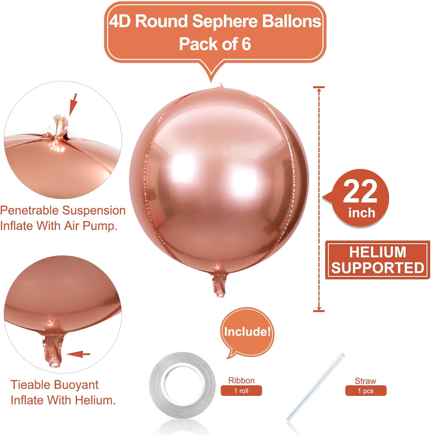 - Large Size Foil Balloons: 6 Pcs 22 inch 4D Round Foil Balloons (uninflated) + 1pcs Straw +1pcs 32 foot Ribbon Roll,Multiple colors are available: Gold ,Silver, Hot Pink, Rose Gold, Red,Orange,Black,Blue,Purple,Pearl Blue and Pearl Pink 11 colors to choose from,there must be one color can match your party theme.