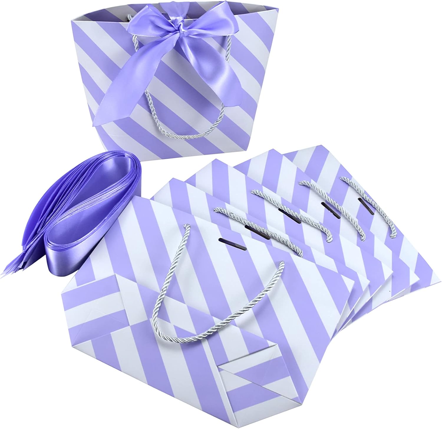 HUAPRINT Gift Bags with Handles,7.48×3.54×7.9 inches,Party Favor Bags with Bow Ribbon,12Pcs White and Light Purple Stripe Paper Bags for Birthday Wedding Bridesmaid Present Celebration Holiday