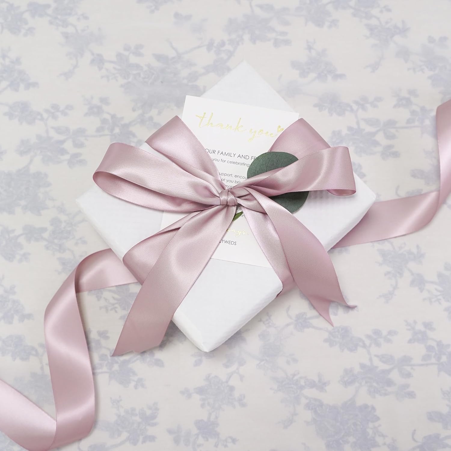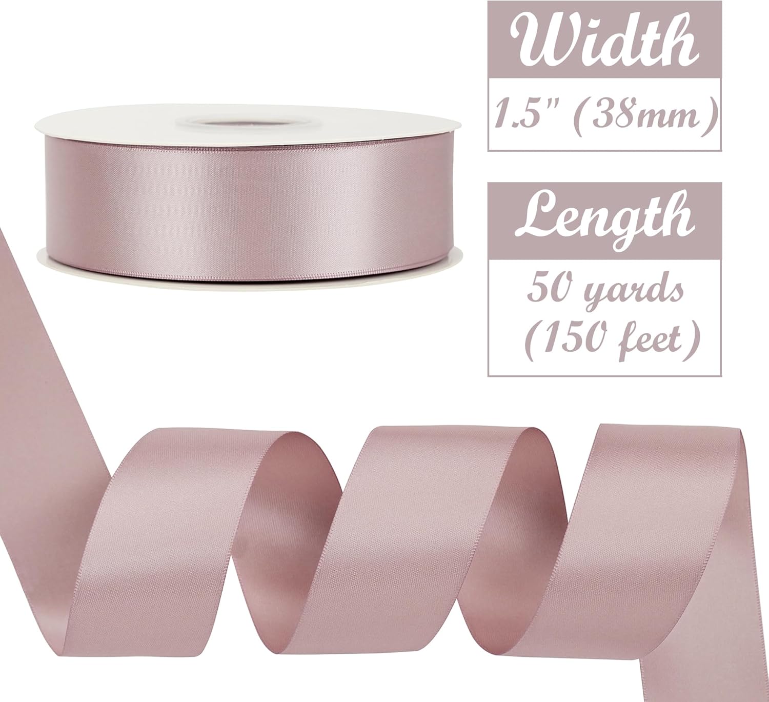 - Size: Dusty rose ribbon measures 1.5 inch wide and continuous 50 yards (150 ft) long in a complete roll in a paper box. For various decorations and crafts, such as decoration for party, flower bouquet, gift wrapping and all ribbon crafts making