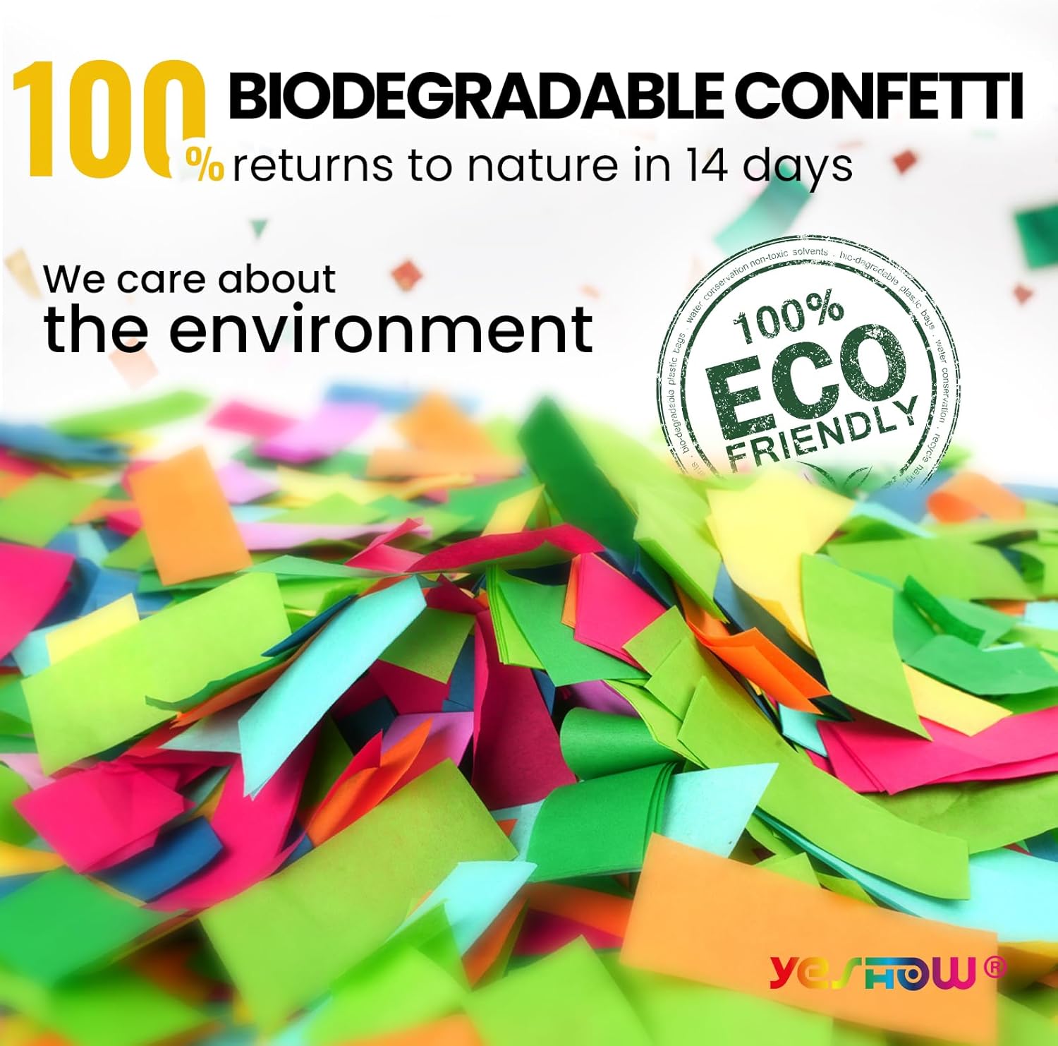 - đăECO-FRIENDLY BIODEGRADABLE CONFETTIă Our confetti cannon is filled with 100% biodegradable confetti that breaks down naturally and is completely non-toxic. Not only is it eco-friendly, but itâs also flame-resistant, stopping immediately if exposed to fire. Plus, cleanup is a breezeâperfect for hassle-free celebrations