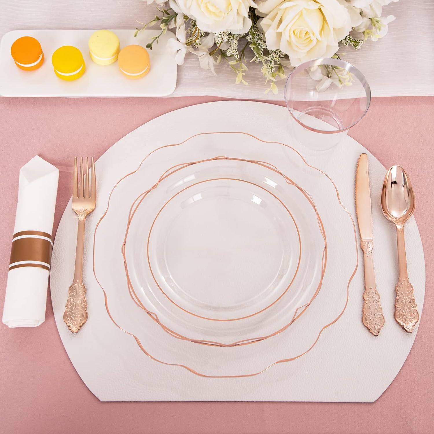 - NO CLEANING: Our clear plastic plates and rose gold cutlery are not need to be cleaned, so you can spend more time resting or with your family after the party. Disposable design makes cleaning easy. These clear party plates with rose gold rim are the perfect solution for elegant dining!