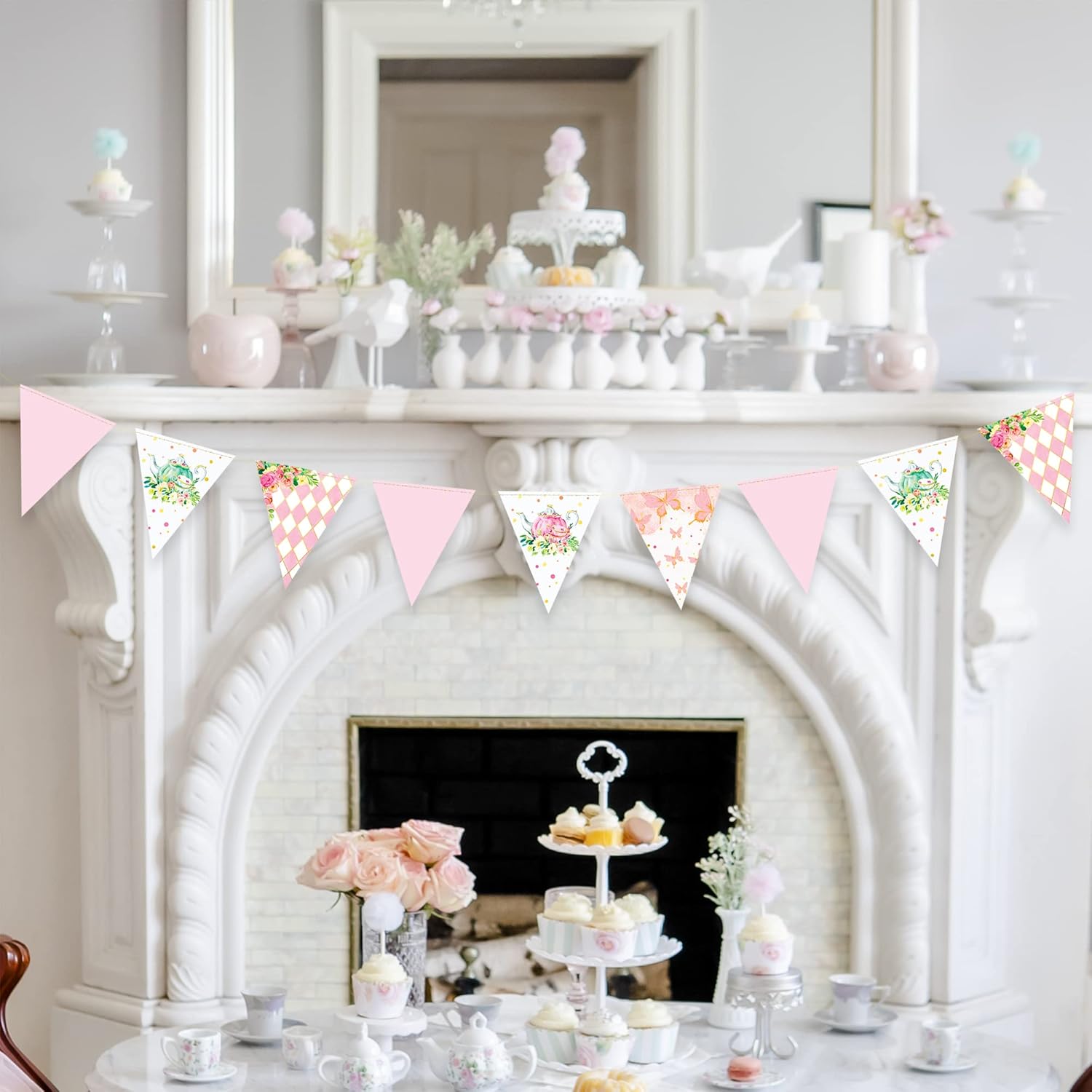 - 🫖UNIQUE DESIGN- Tea party classic elements teapot teacup and floral flower butterfly plus diamond plaid design with pink teal and gold pastel color,Perfect for spring tea party decorations to create magical festive atmosphere for your family and friends!