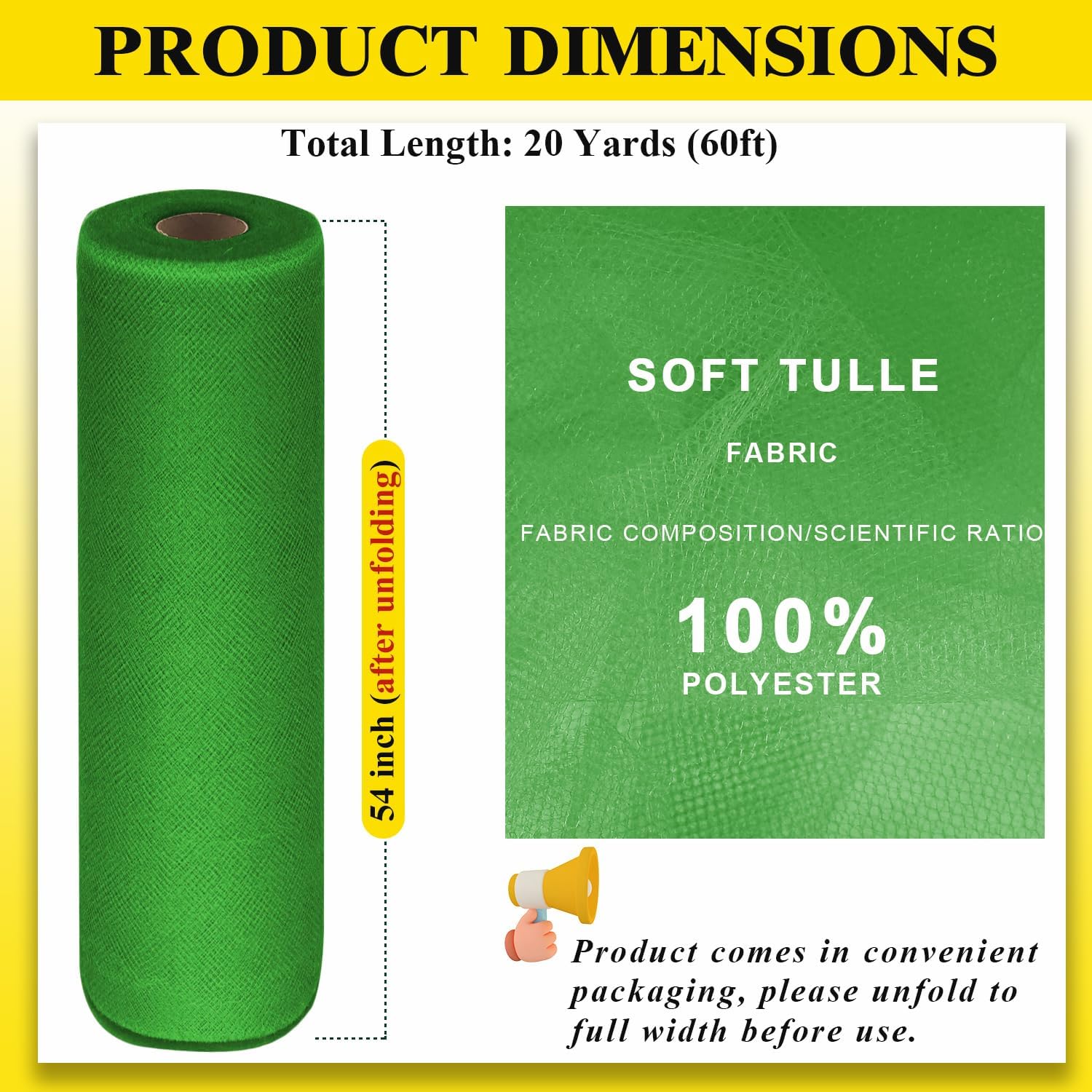 - Cut as Desired: 54 inches is not limited in size and can be cut to any size. Perfect for tutu skirts, pew bows, chair sashes, table skirts, gifts bouquet wraps, crafts and garden cover netting. Unfold roll packing's full width before use.
