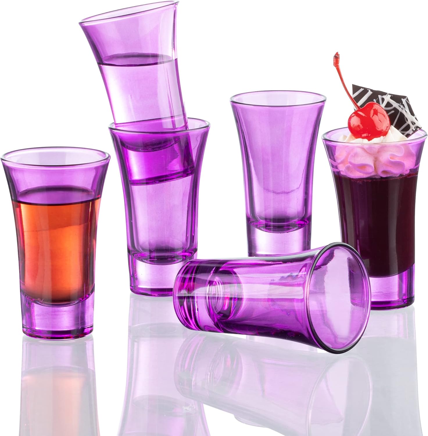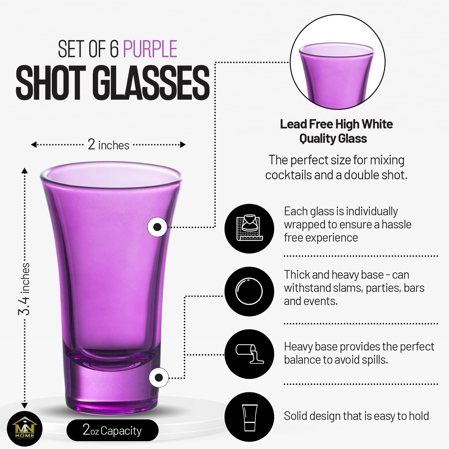 - Purple Shot Glasses- Set of 6 fully colored purple shot glasses. 2 Oz capacity shot glass, the perfect size for mixing cocktailsand a double shot. 3.4" High x 2" Diameter. Solid seamless design that is easy to hold and drink from. Each glass is individually wrapped to ensure a hassle free experience.
