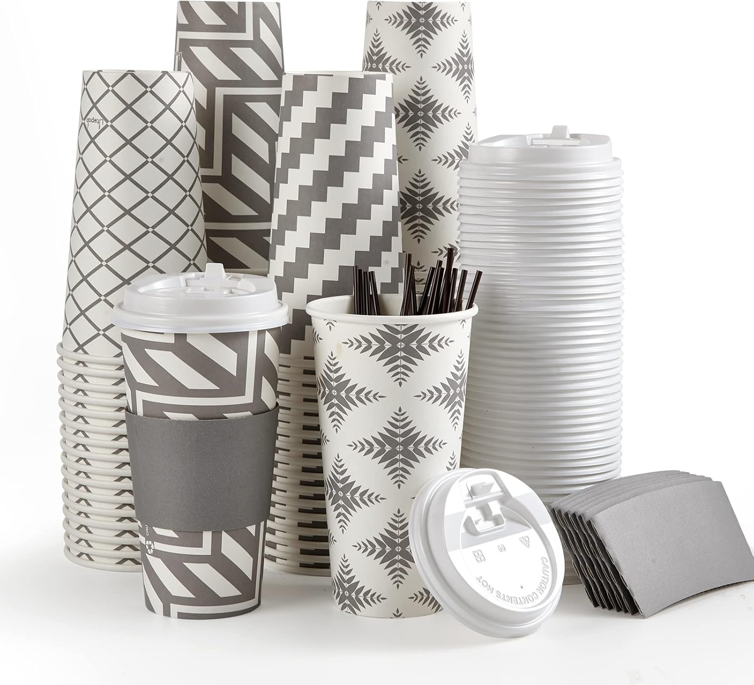- Great Value Pack: You will receive 100 pack 20 oz disposable cups, including 100 cups in four grey designs, 100 white lids, 100 grey cup sleeves, and 100 straws