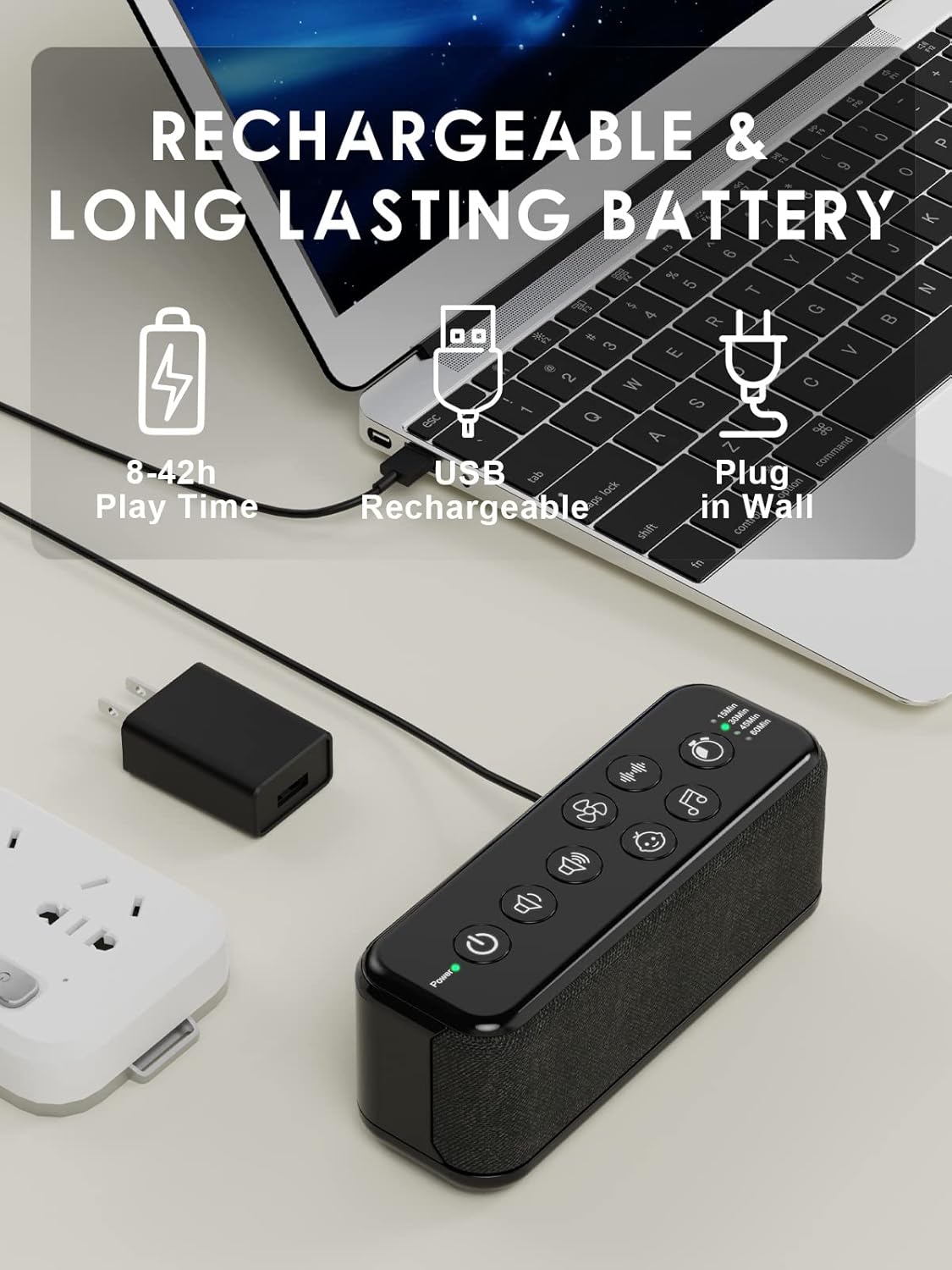 - π Rechargeable, Cost-Effective Battery: No more wasting money on AA batteries. This rechargeable sound machine, after fully charged, can last 8-42 hours(depending on the volume grade) of play time. Ideal for uninterrupted sleep or focused work throughout the day
