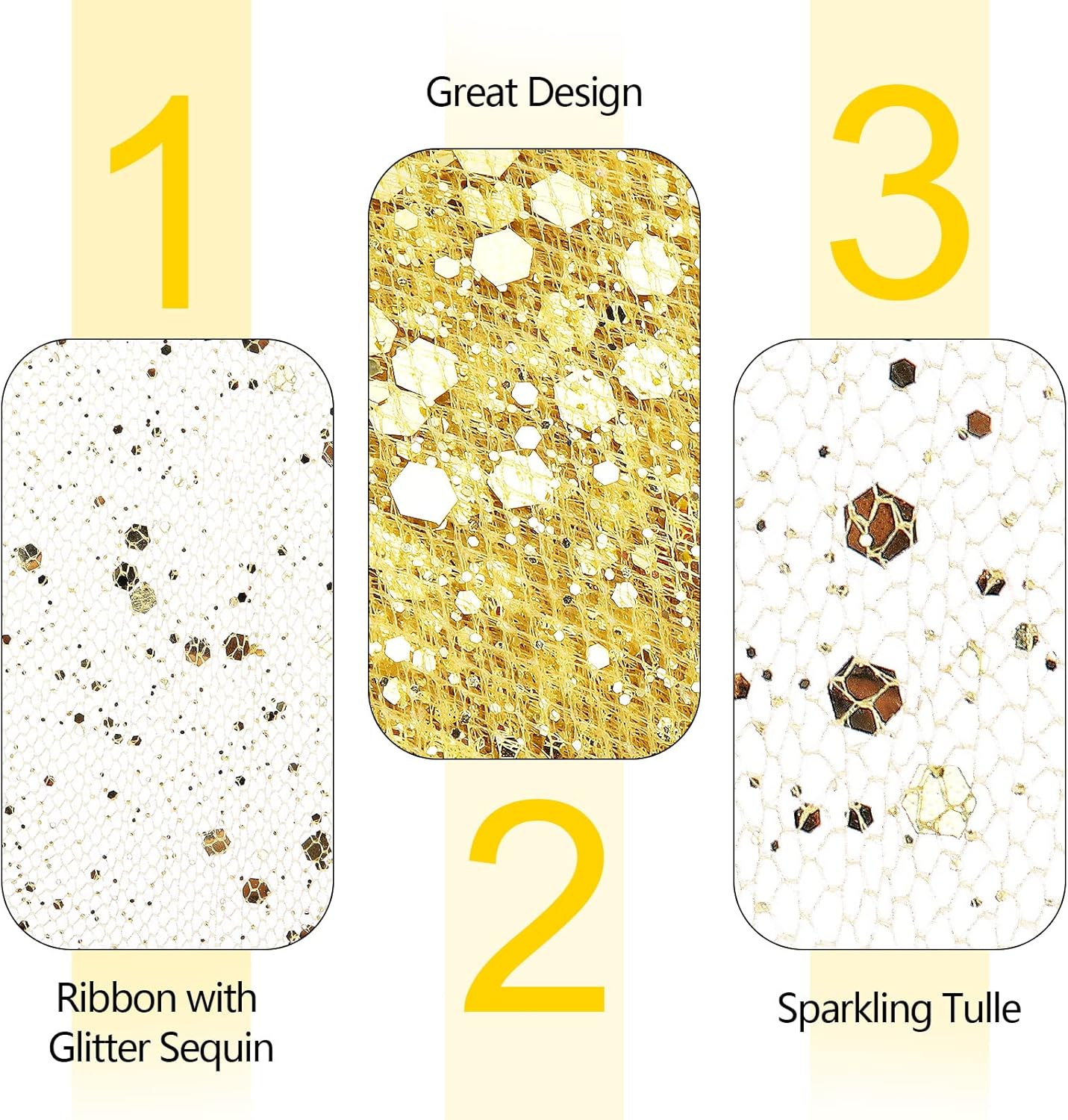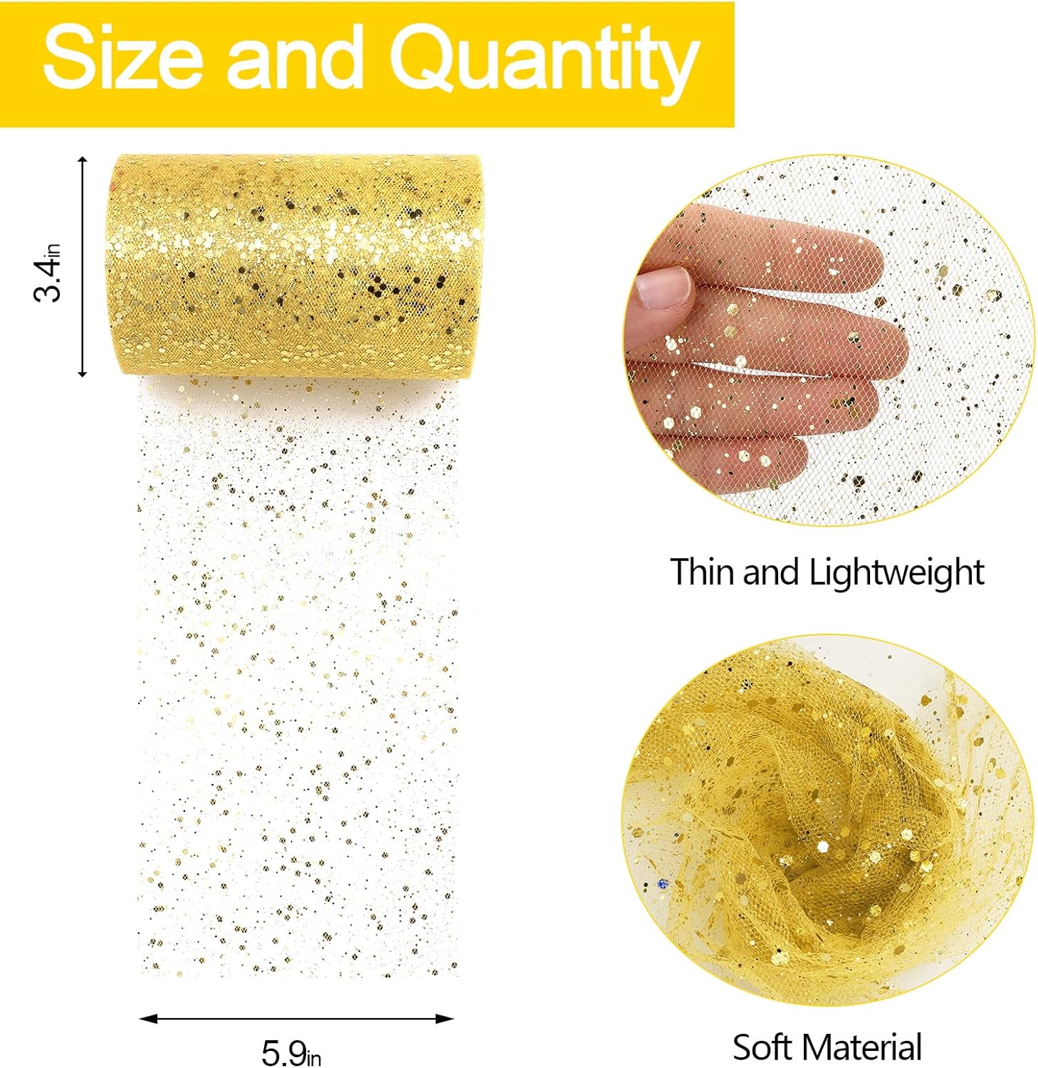 Glitter Tulle Rolls, 6” by 50 Yards (150FT) Sparkling Tulle Spool Ribbon Sequin Tulle Netting Fabric for Tutu Skirt Wedding Birthday Baby Shower (Gold)