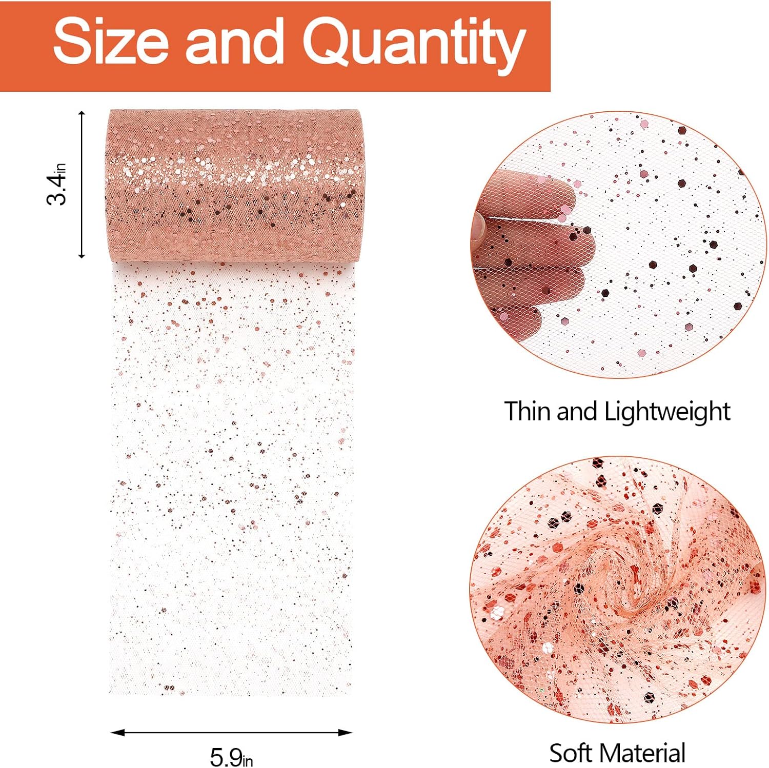 Glitter Tulle Rolls, 6” by 50 Yards (150FT) Sparkling Tulle Spool Ribbon Sequin Tulle Netting Fabric for Tutu Skirt Wedding Birthday Baby Shower (Rose Gold)